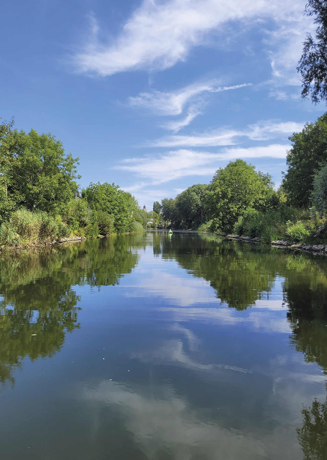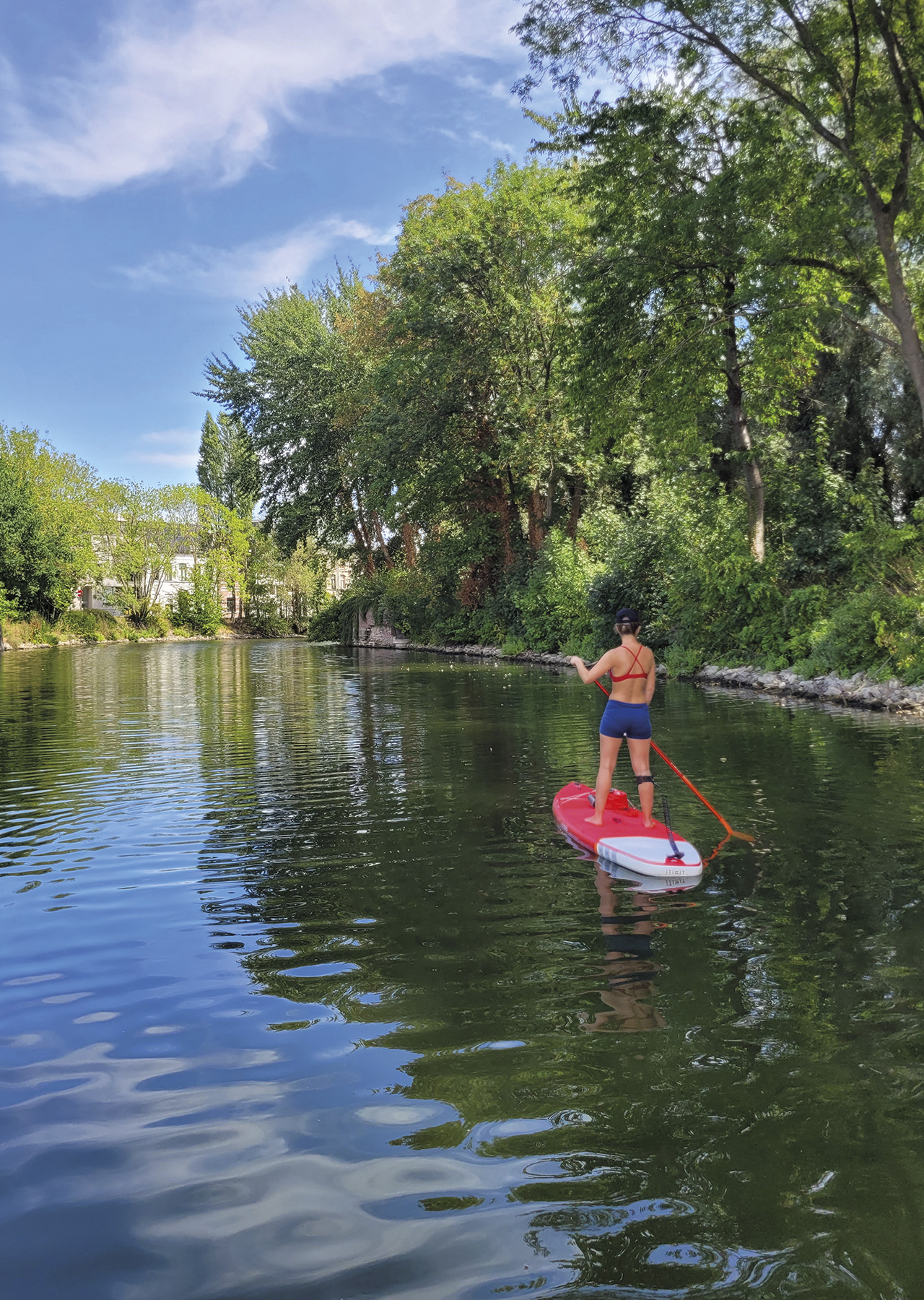 This SUP spot combines a cultural and historical part on the right side, while the left is greener. Let’s start with the city centre, its monuments and bridges. It is ‘funny’ to think that captains, fishermen and ship unloaders used to work here in the past! In the distance, you will see the two red brick bell towers of the Abbey of Saint Peter and Paul.