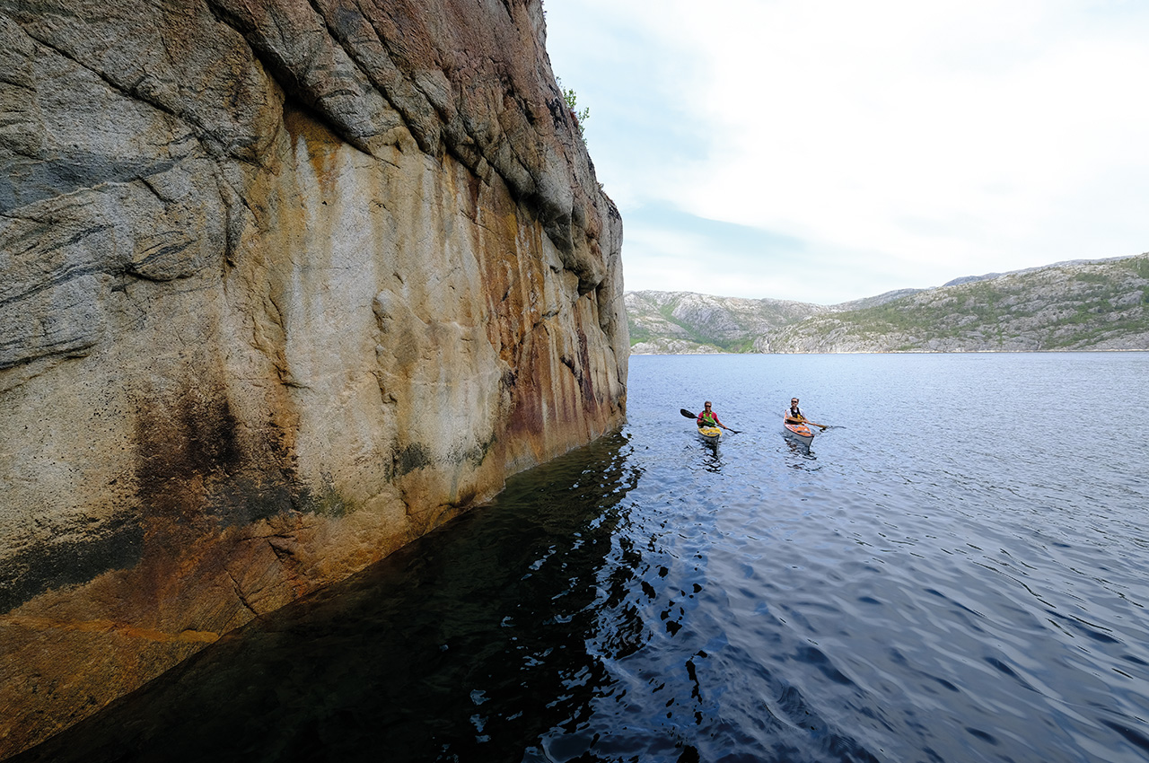 We parked our cars in the small town of Visthus and put the sea kayaks anxiously on the emerald waters of Vistenfjord. It is in fact rated as the cleanest in northern Europe and we were going to spend two days paddling it from ocean to inland. Our goal was to explore a corner of Norway not much visited and allowing for some small adventures along the way. Anticipation built up as we left the main fjord and paddled into Langkilvågen, which is a small fjord arm cutting stubbornly into the land.