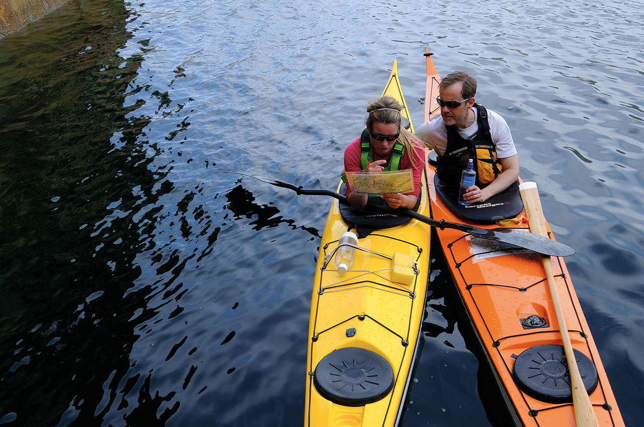 We have spent the good portion of the day paddling the outer reaches of the fjord, discovering small abandoned farms and houses along the way. The birdlife is rich, and we keep scanning the forests – are they boreal rain forests, or elm and hazel? As we approach the end of the first day, the first obstacle appears. The Strait of Aussundet is a narrow passage in the fjord – a reminder of the glacier that once shaped the region, which also left a moraine that makes the ocean shallow right here.