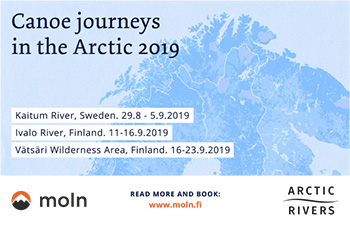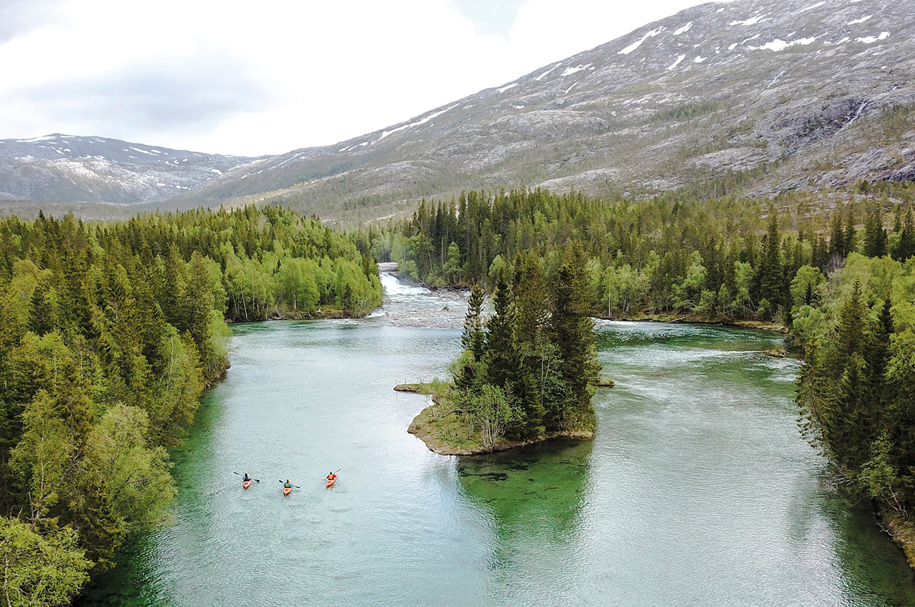 The river Sæterelva tumbles down from the mountains in the inner regions of Lomsdal-Visten, but in its final stages it meanders its way down to the lake Lakselvvatnet, only occasionally being disturbed by large waterfalls. The waterfall Mølnhusforsen is one of those, and the last one in the river bed before it meets the ocean. We can hear it from afar as we paddle up the crystal clear river. Big pines surround the river bed, and there are numerous signs of beaver all along the water.