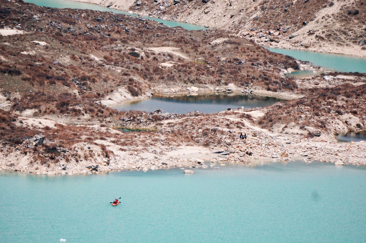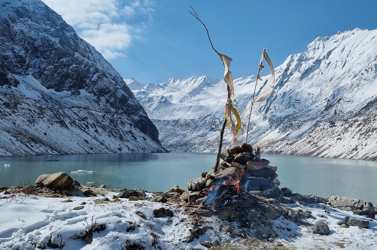 Two memories stand out from the expedition for Duncan and me – the first was the feeling of paddling up the lake each morning, admiring the surrounding mountains and the towering glacier face ahead of us; the only sound to be heard was our paddles breaching the still waters’ surface. The second was the daily ritual that our Sherpa cook performed before paddling each day. Glacial lakes are believed to be the abodes of gods and goddesses by many mountain communities.