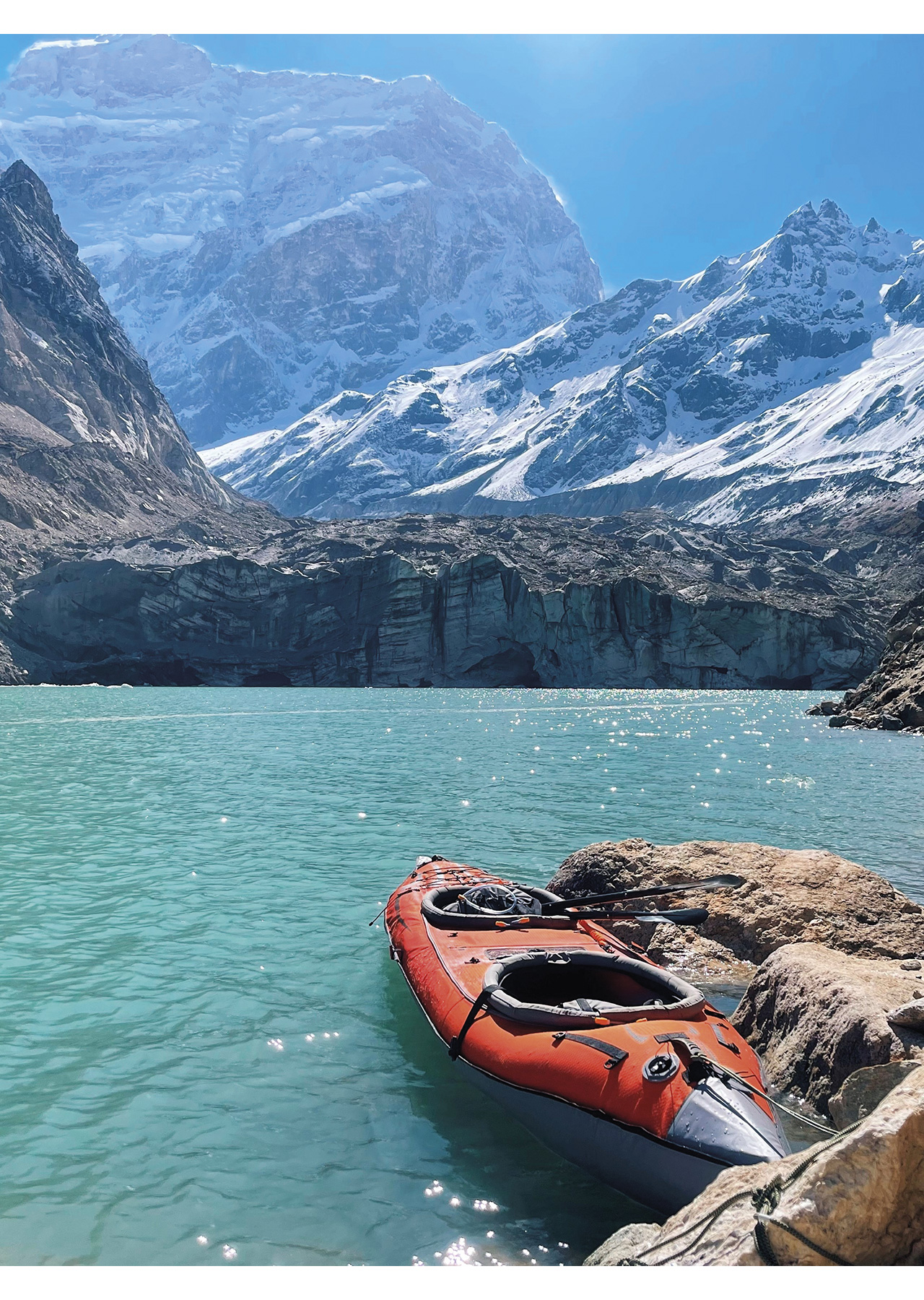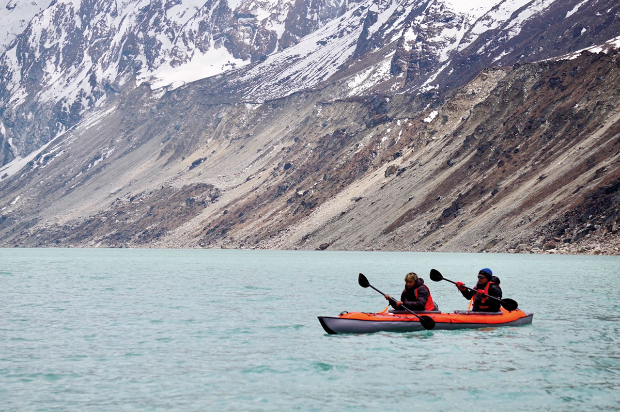 One of our first challenges was sourcing a tandem kayak that could be transported on foot to the lake. Here, Nick Pipe, who runs Vortex, an independent retailer importing Advanced Elements equipment to the UK, came to our rescue. We acquired an Advanced Elements Convertible Elite kayak through his sponsorship of our expedition. This fifteen-foot tandem kayak packs down into a large backpack weighing 25kg, perfect for our highly experienced porters to transport to high elevation.