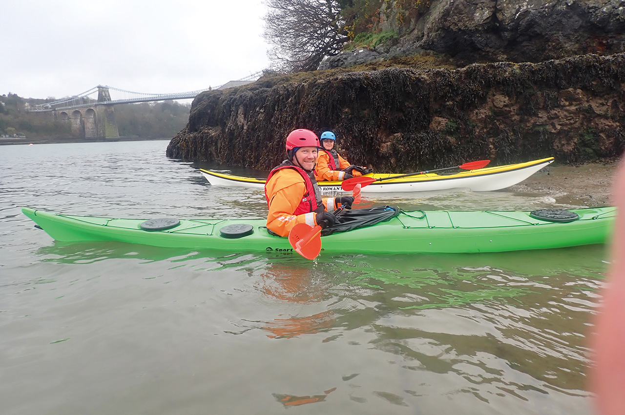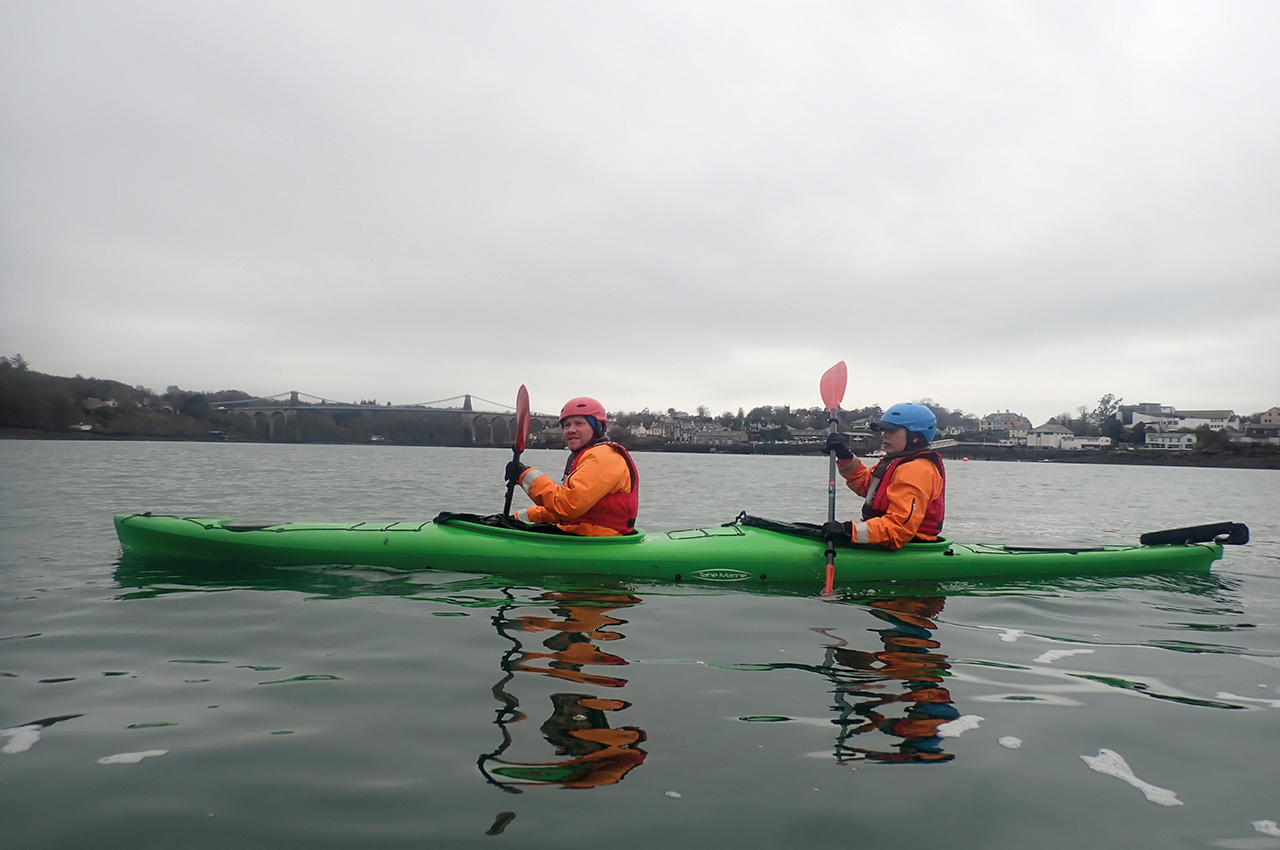 After numerous dry runs, inflating and deflating the kayak in my living room (much to my dog’s confusion), we knew we needed to seek expert guidance in learning how to kayak in tandem and to deal with the highly changeable, extreme conditions at Dona Lake. In March, we headed to Anglesey to join Geth Roberts, owner of Sea Kayaking Wales, for a full day of coaching on the Menai Strait. On a drizzly but warm day, we launched our kayaks on a slack tidal moment, exploring the Swellies area between the Menai Straits’ bridges. After a lunch stop, we paddled out towards Bangor Pier, crossing back towards Anglesey, recording the depth and bathymetry of the strait with a Deeper+ CHIRP sonar, an excellent test run ahead of our expedition.