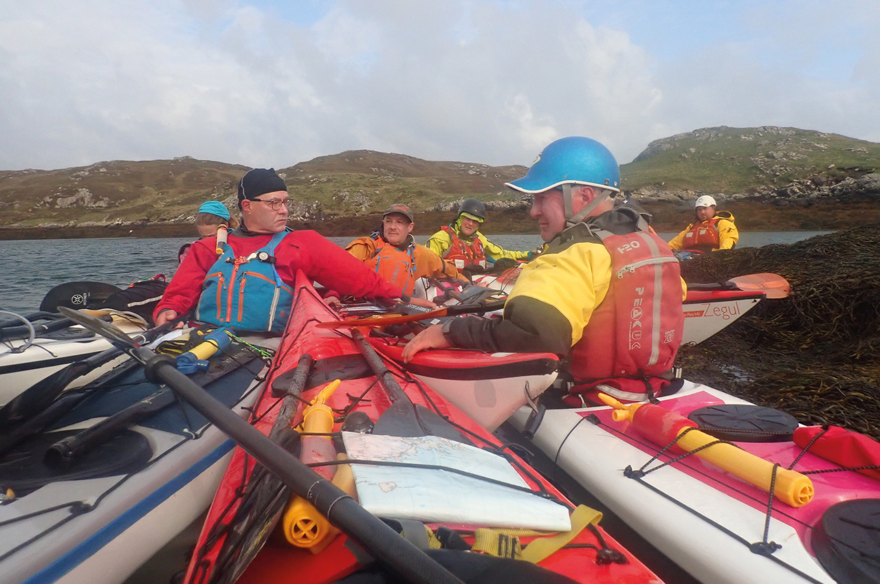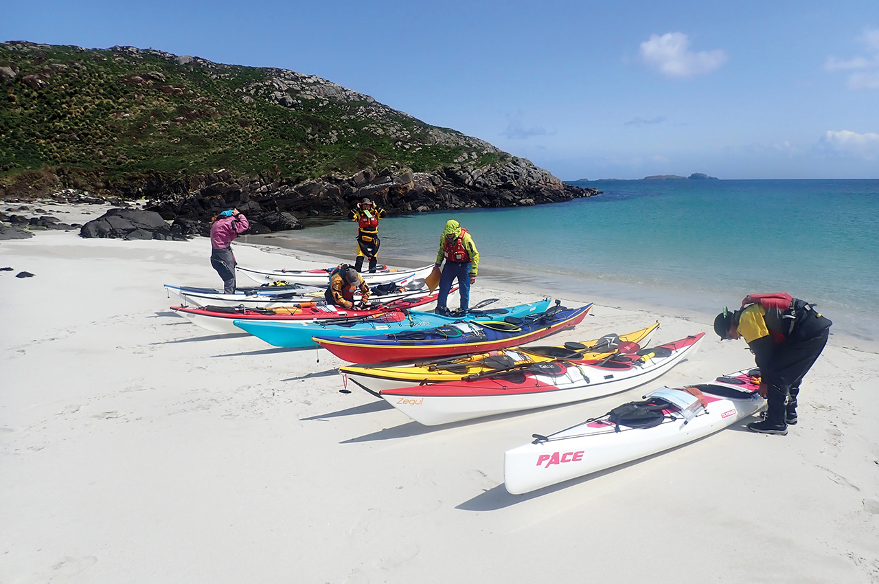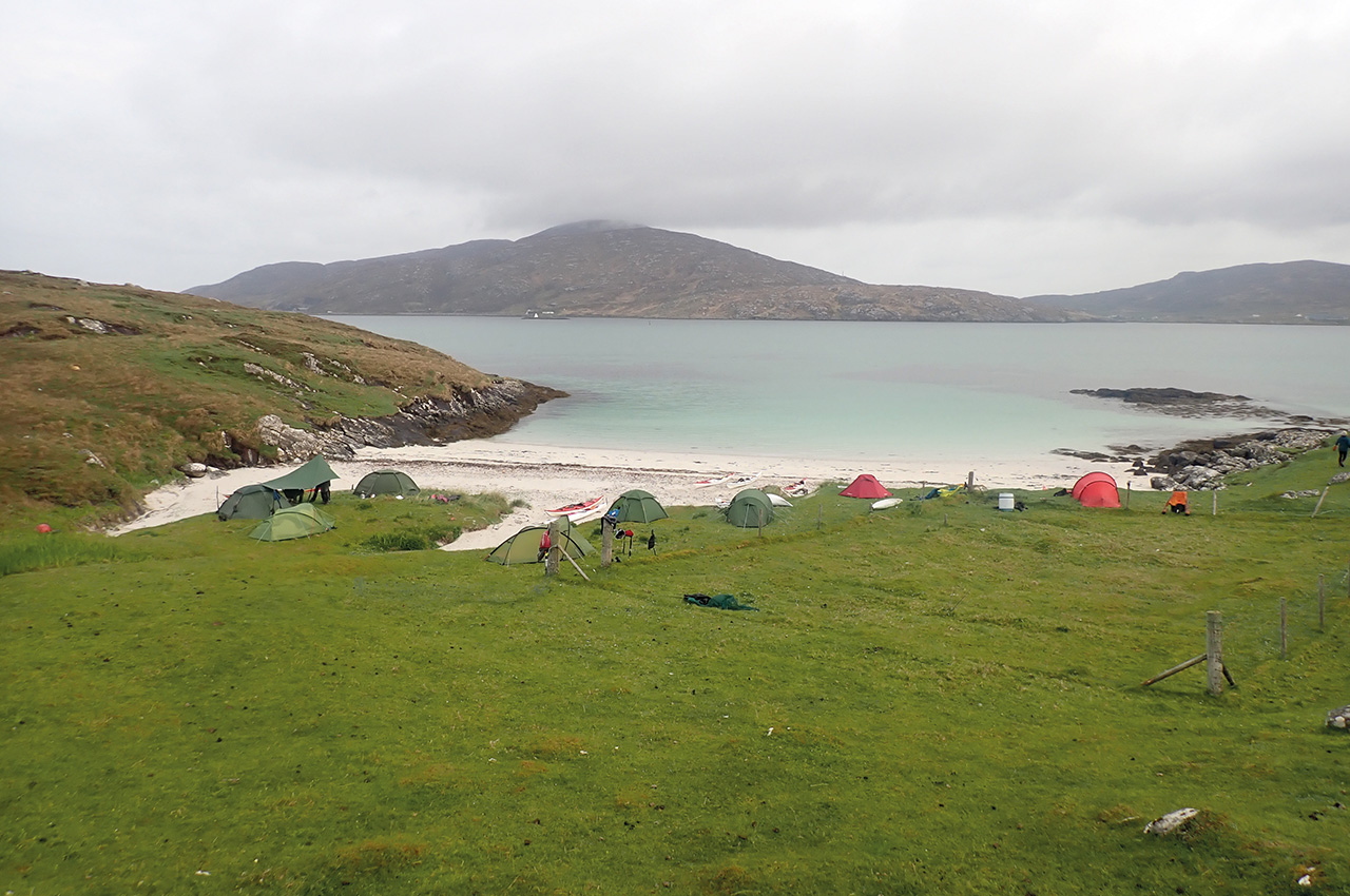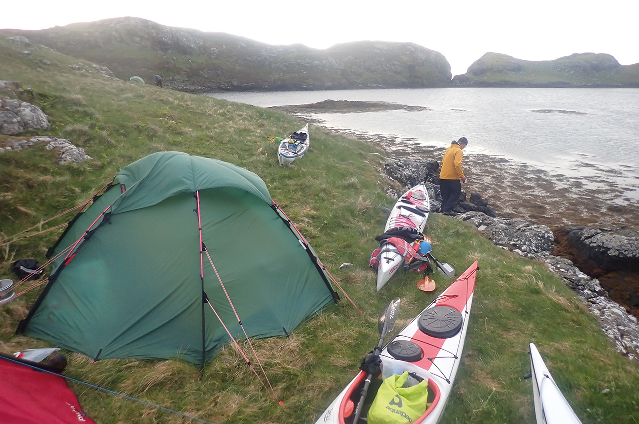 I’m on Vatersay, Outer Hebrides, reflecting on what makes a great sea kayaking expedition. My tent doorway frames a beautiful pale sandy beach and azure sea. The blue sky has been replaced by cloud and wind, remnants of a cold front neatly bisecting our week. Our team members chat under the neighbouring tent’s extended tarpaulin porch, planning the next days following this timely wind-enforced rest day.