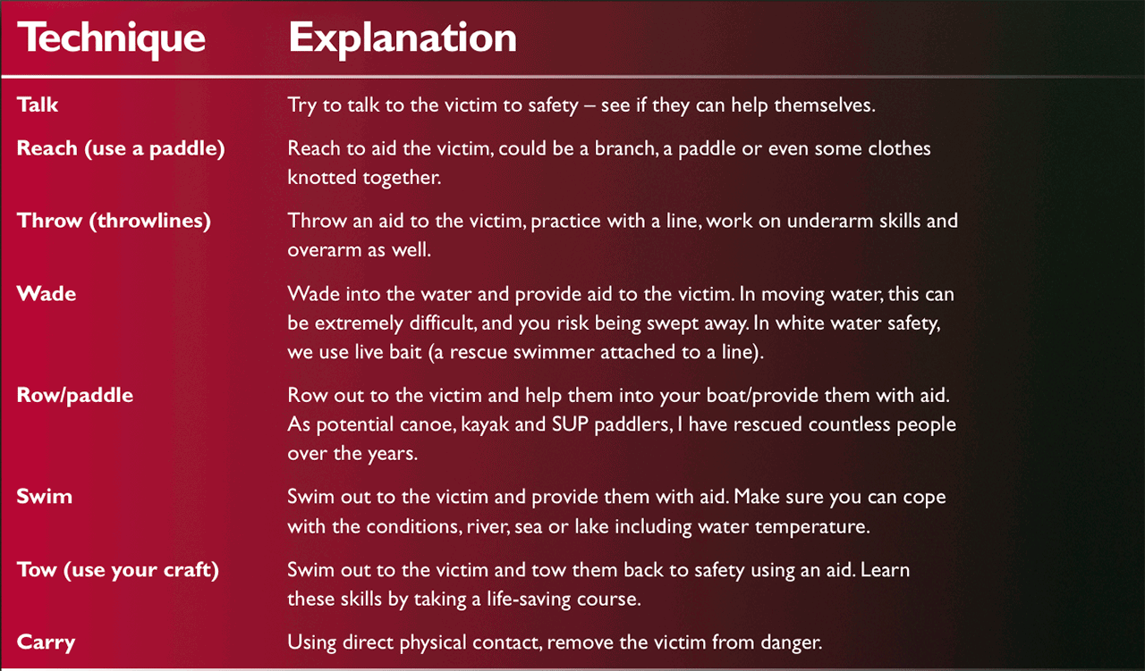 There is a useful hierarchy of water rescue techniques published by RoSPA, which are developed into rescue strategies as part of the FSRT (Foundation Safety Rescue Training).