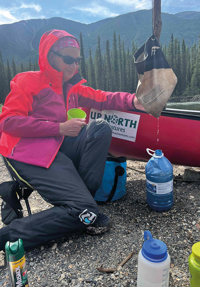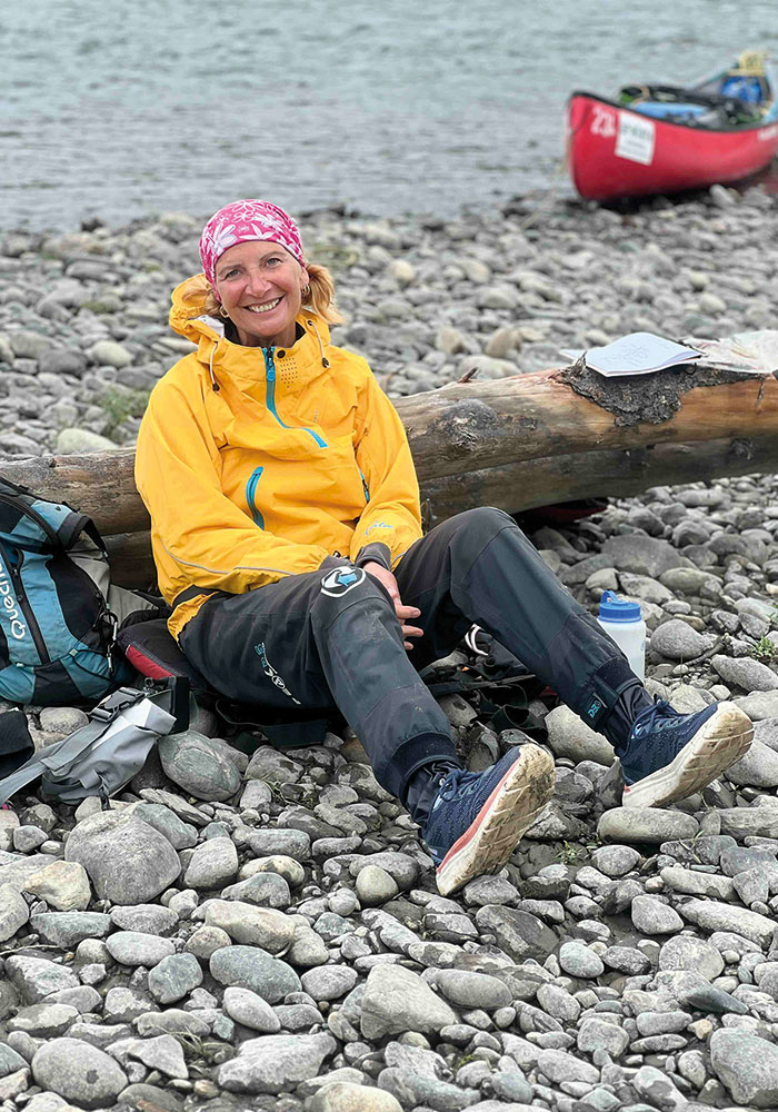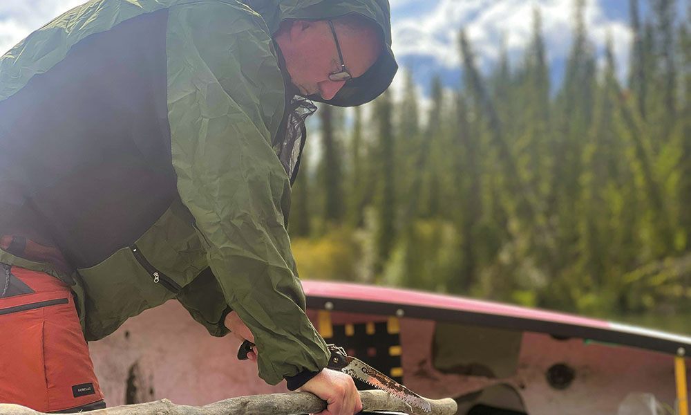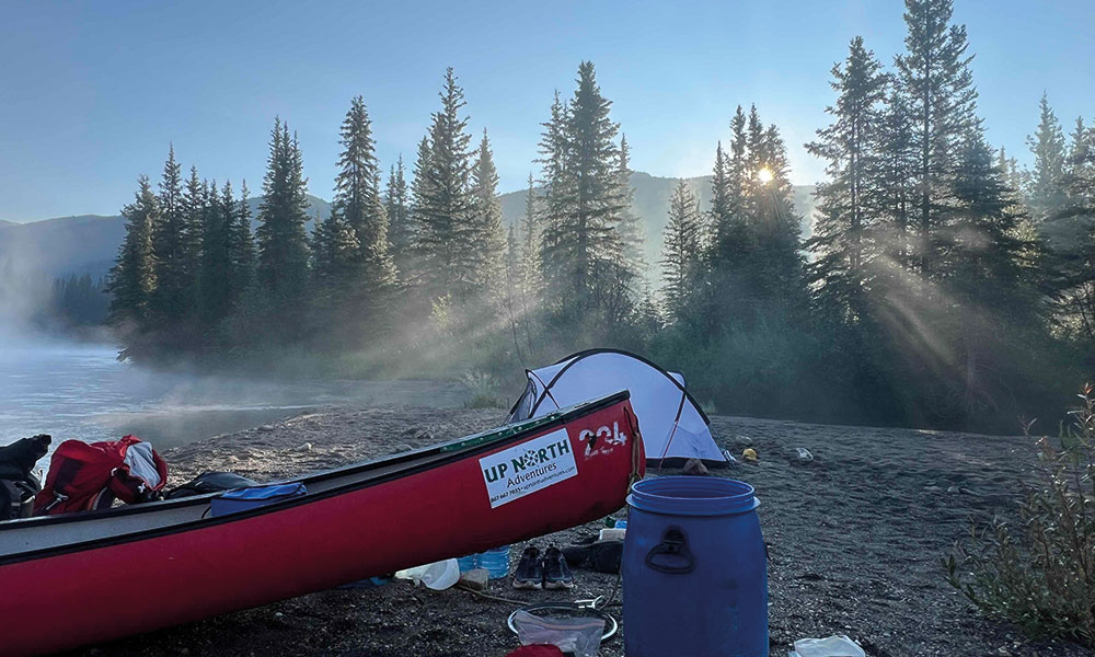 Portaging a fully loaded canoe is not something you do for fun. Bear barrels full of food, safety kits, personal bags – everything had to be carried along a rough path through the spruce. Then the empty canoes were dragged and lifted over the portage route, tied off with highwayman’s hitches for easier handling. It didn’t take long to repack and shove off again, but half an hour later, another logjam appeared. This one was shorter, but the mosquitoes were worse – a cloud of whining persistence We renamed the river the ‘Bug Salmon’ on the spot.