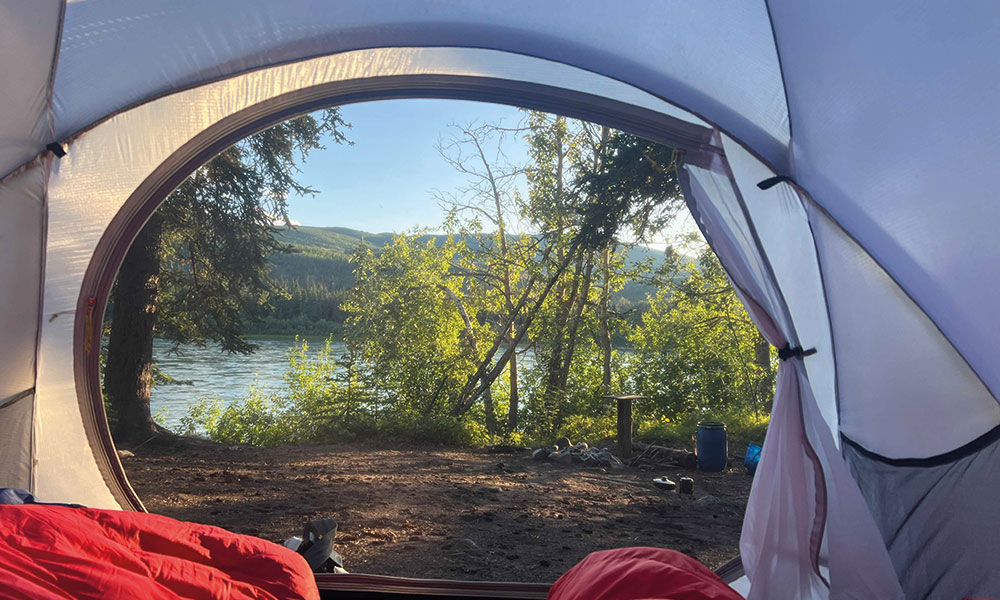 At the confluence with the Yukon River, the landscape opens dramatically. The Big Salmon Village once stood here — a major First Nations settlement. We camped on a wide gravel bar, grateful for the sudden drop in mosquito numbers.