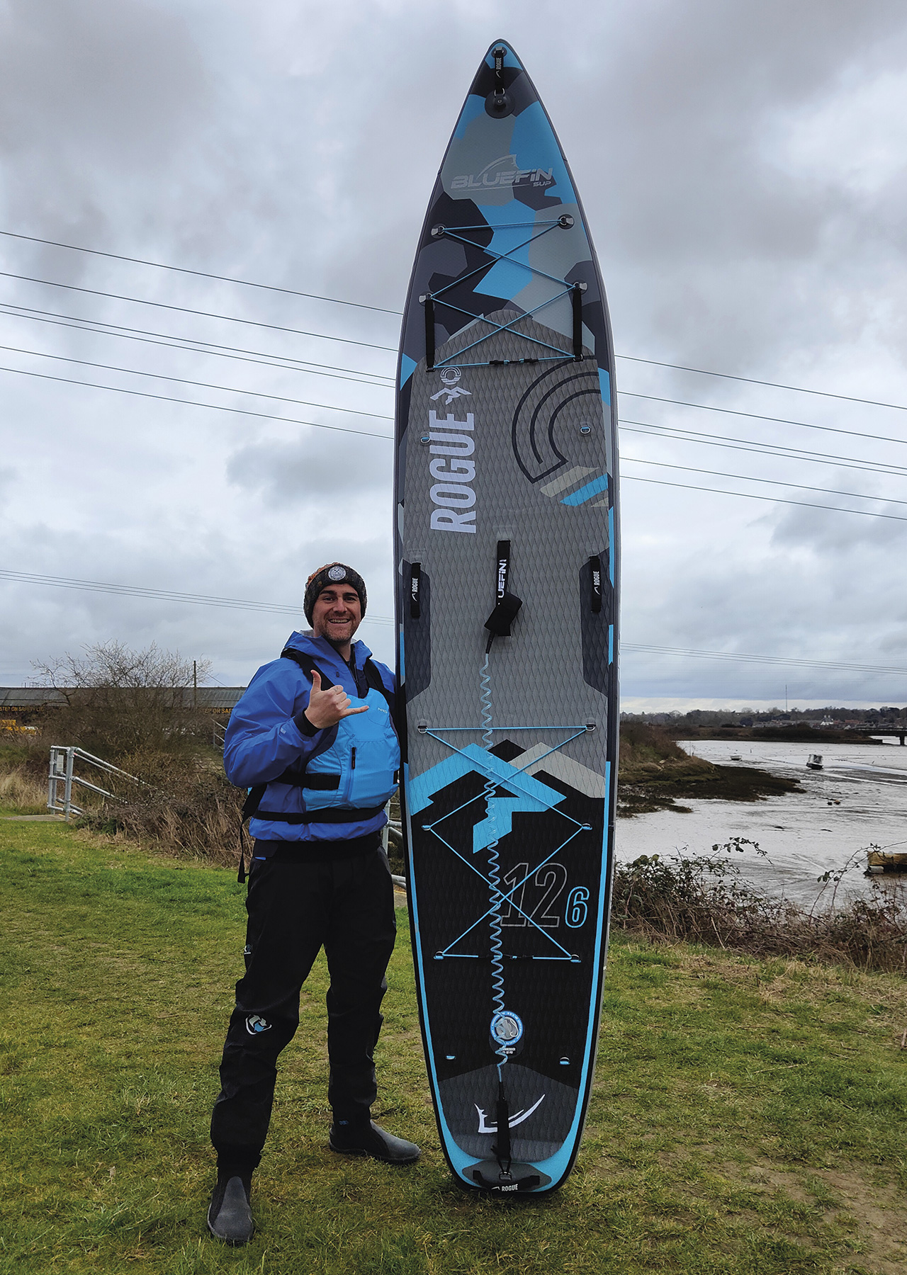 At 12’6” x 30”, the Rogue fits into the ‘touring’ category. Bluefin has designed a very sturdy board, including carbon-looking tape that runs along the top and bottom of the rail, which hides the seams and creates their reinforced Flex Reduction System – meaning a stiffer board! Something I’ve noticed with Bluefin is they do love an acronym!! I loved the oversized centre handle, making it super easy to grab the board whilst keeping it perfectly balanced.