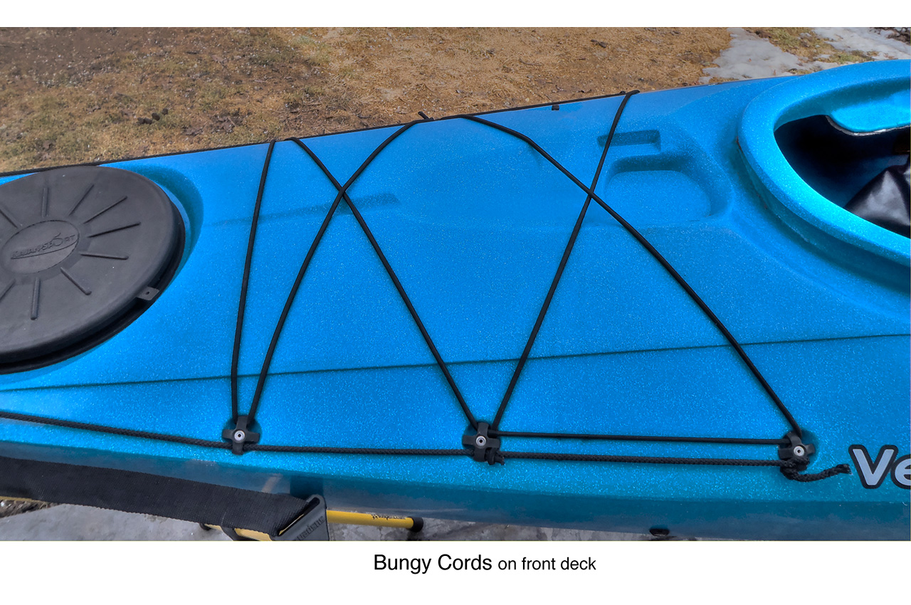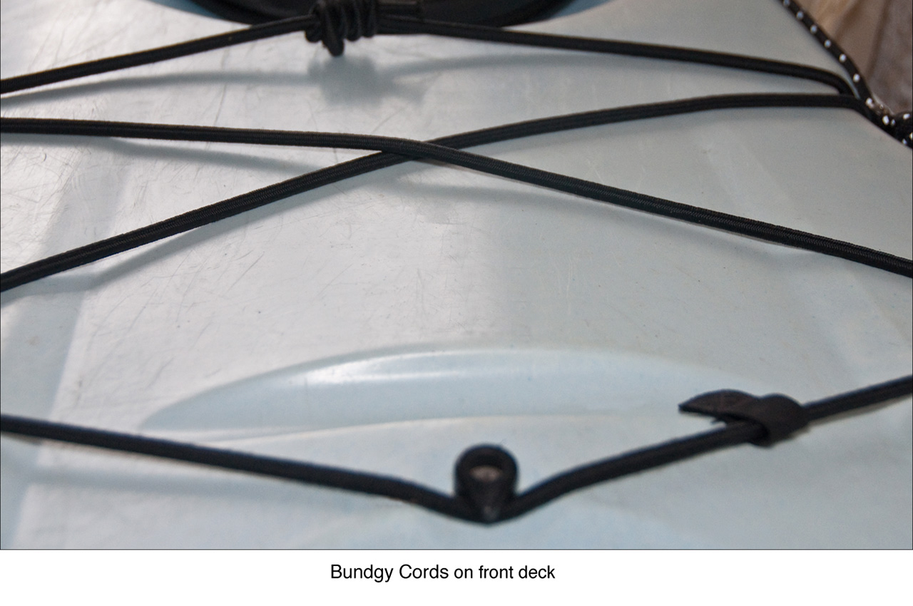 Another feature you want to find on a kayak is more than a few elastic ‘bungee’ lines. Bungees are suitable for holding a limited amount of gear to the deck of your kayak. However, they are not replacements for ‘hard lines’ or ‘perimeter deck lines’. These lines trace the outline of your kayak and do not stretch. You will grab these lines to help pull you back into your kayak should you happen to fall out. If you are in the water and all you have are bungees, stop and think what will happen. They will stretch, and you will return to the water you were trying hard to escape. A combination of bungees and hard lines is how a kayak should be outfitted to serve you in almost any situation. One word of caution about bungees: people tend to put too much on top of their kayak while neglecting to put stuff in their kayak.