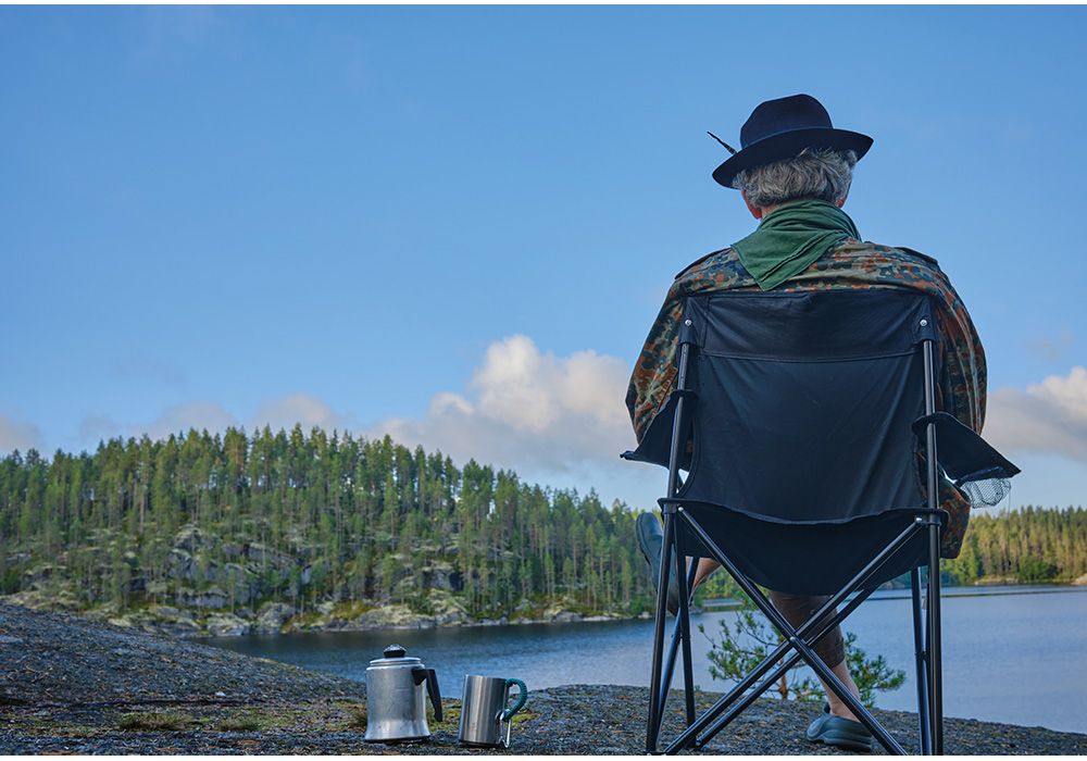 Tina and I brought our chairs to the water’s edge as Kalevi shoved off, wishing him luck. As he exited the bay with the sun behind him, he raised his paddle in salute. We raised our arms in reply. A breeze rustled the pines in camp, and I took note that, fittingly, the wind would be at Kalevi’s back.
