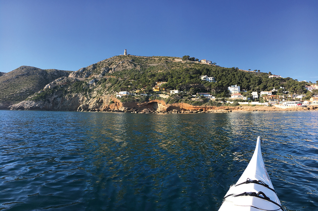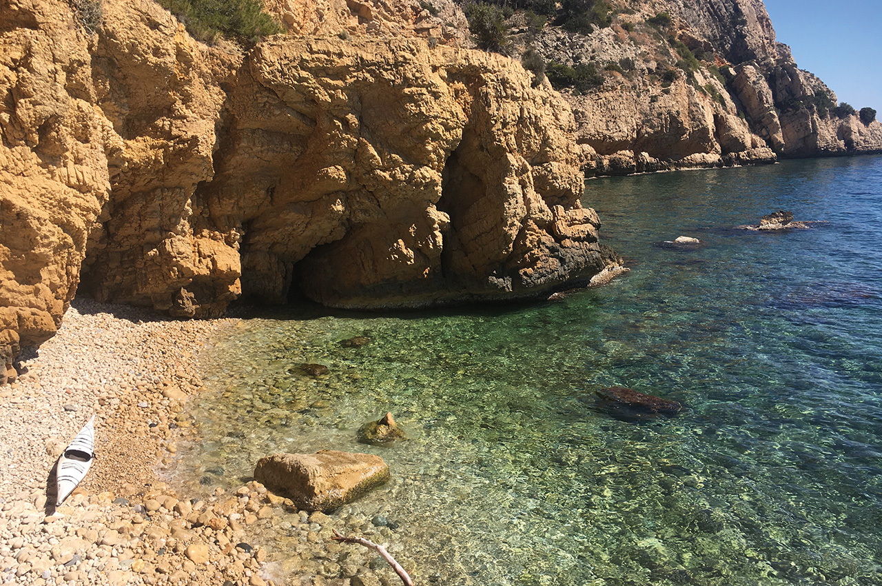 From the launch site it’s a straightforward paddle to the south east, firstly along the low lying rocky shoreline of Les Rotes, a rocky shelf that is a protected reserve in it’s own right due to its unusual formation and the rare plant species that inhabit it. Watch the depth as you cross the rocky points, it gets very shallow and if there’s any swell you might touch down in the trough. Paddle on past a couple more restaurants, and then the road terminates by some houses built precariously over vast sea caves that completely undermine them – quite a sight. The views further inland of the grey terraced mountains of the ‘Marina Alta’ make a spectacular backdrop to the adjacent red and white sea cliffs.