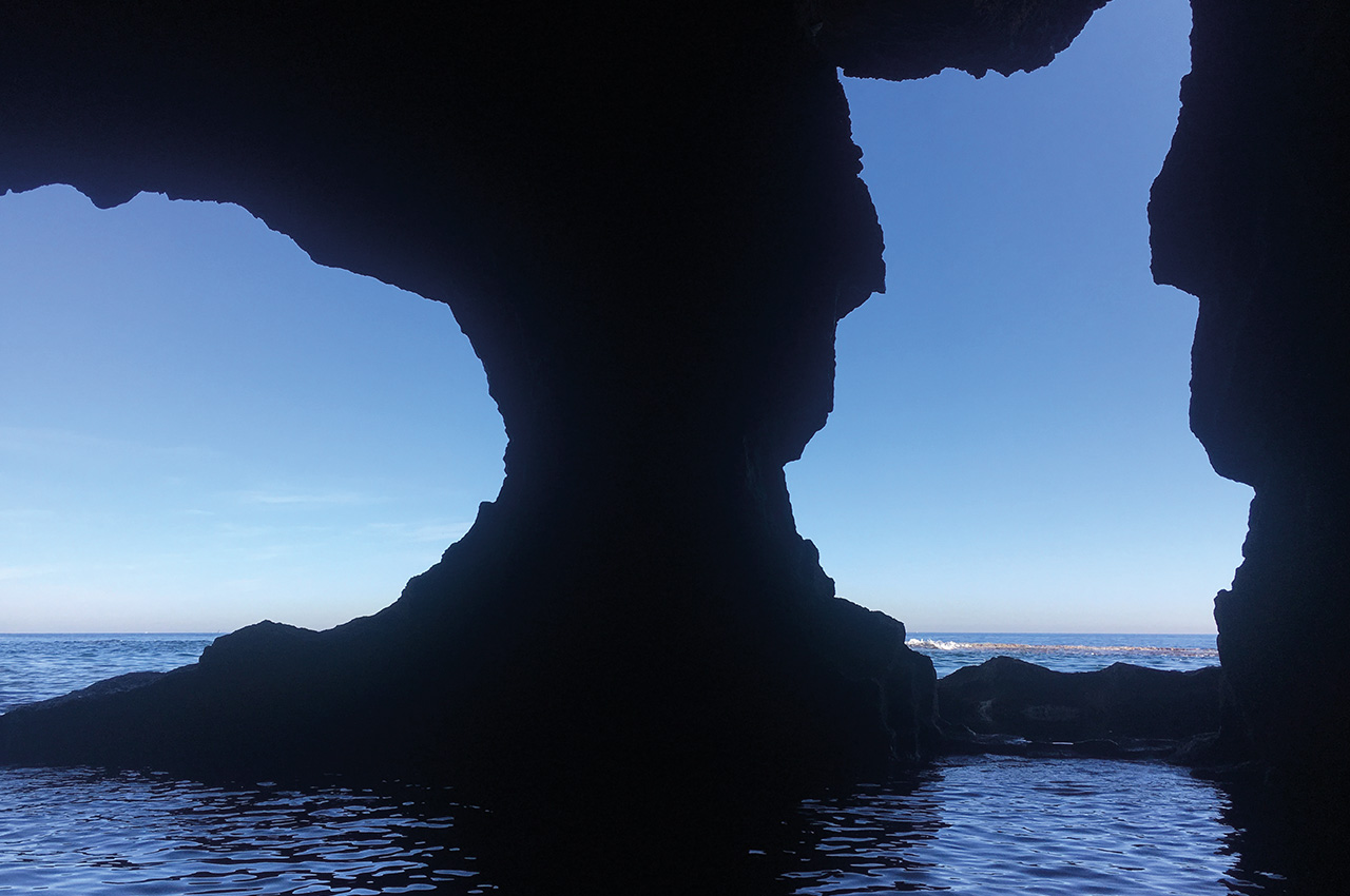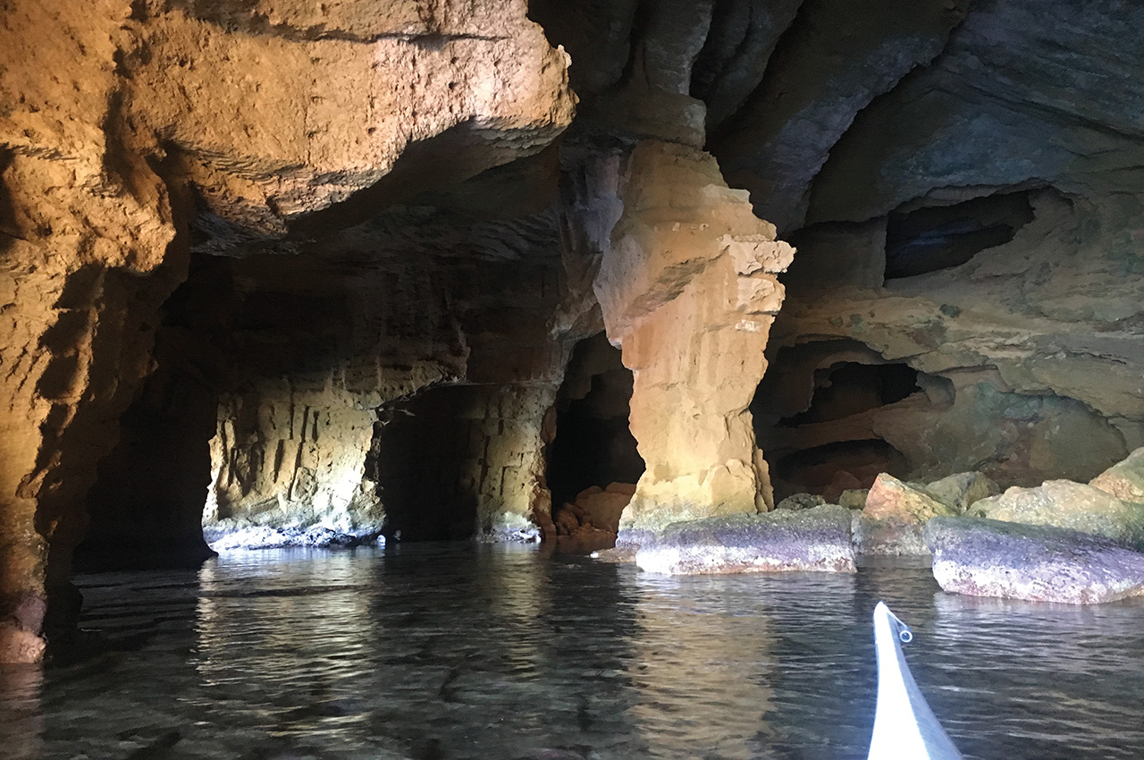 In the bay beneath the lighthouse there are several small caves and a slightly larger one with jagged rock teeth hanging vertically over the entrance. It feels like paddling through a set of giant jaws and makes the dark, low ceiling cave even spookier than normal. Inside, the swell produces church organ bass notes as air is squeezed through a variety of flumes and funnels.