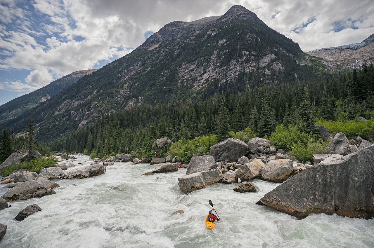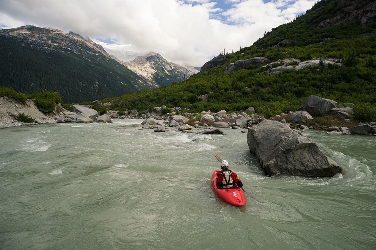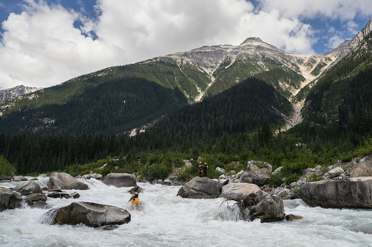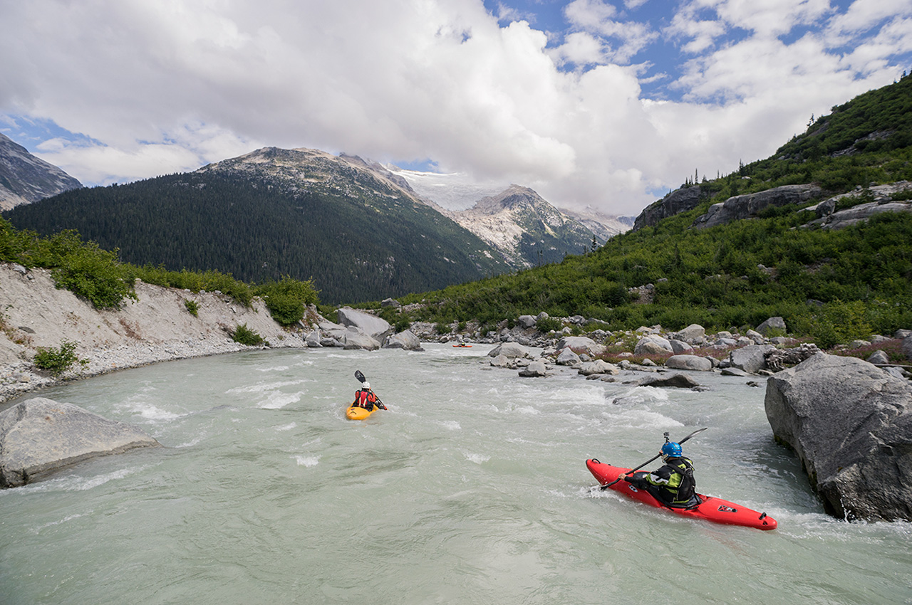 Some nice warm up behind us and a glacier sits high above on the right. An old avalanche path leads to the river and it makes sense to see a boulder pile just downstream. We routed through one rapid then scrambled for eddies. This one didn’t look so nice. The whole team portages 15 feet then it was time to make a decision.