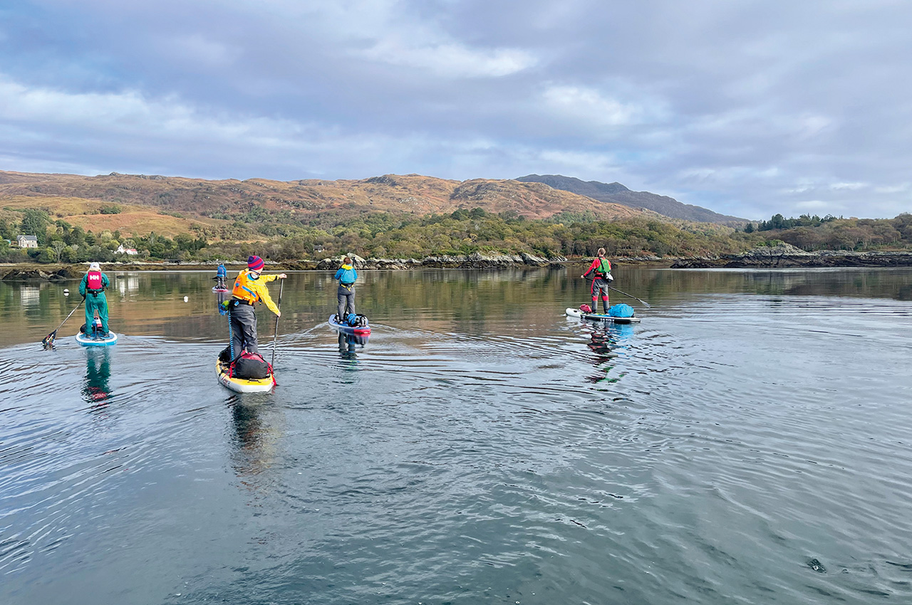 We arrived at our launch point after a wee trip over the Corran Ferry and an 90-minute drive into what felt like the wilderness. Again, beauty all around. The weather was behaving itself, and so the big unload began. Boards, kit bags, day bags, paddles, trussed up safely in drysuits, multi-warm layers underneath, PFDs and warm hats. We had to portage the first 100 metres or so, lugging boards and bags in relays. As soon as we were ready and had made a plan of action, the weather started to change very rapidly, getting squally with the wind howling down the loch from the open sea. It was a ‘paddle on your knees’ start with the short-lived plan one changing to plan two immediately. This enabled us to grab a great downwinder and then hug an island to give us some shelter. The route to our camp was also changed to make it a more pleasant and safer experience too. This trip taught me to be fluid and if a change is needed for safety reasons, then change.