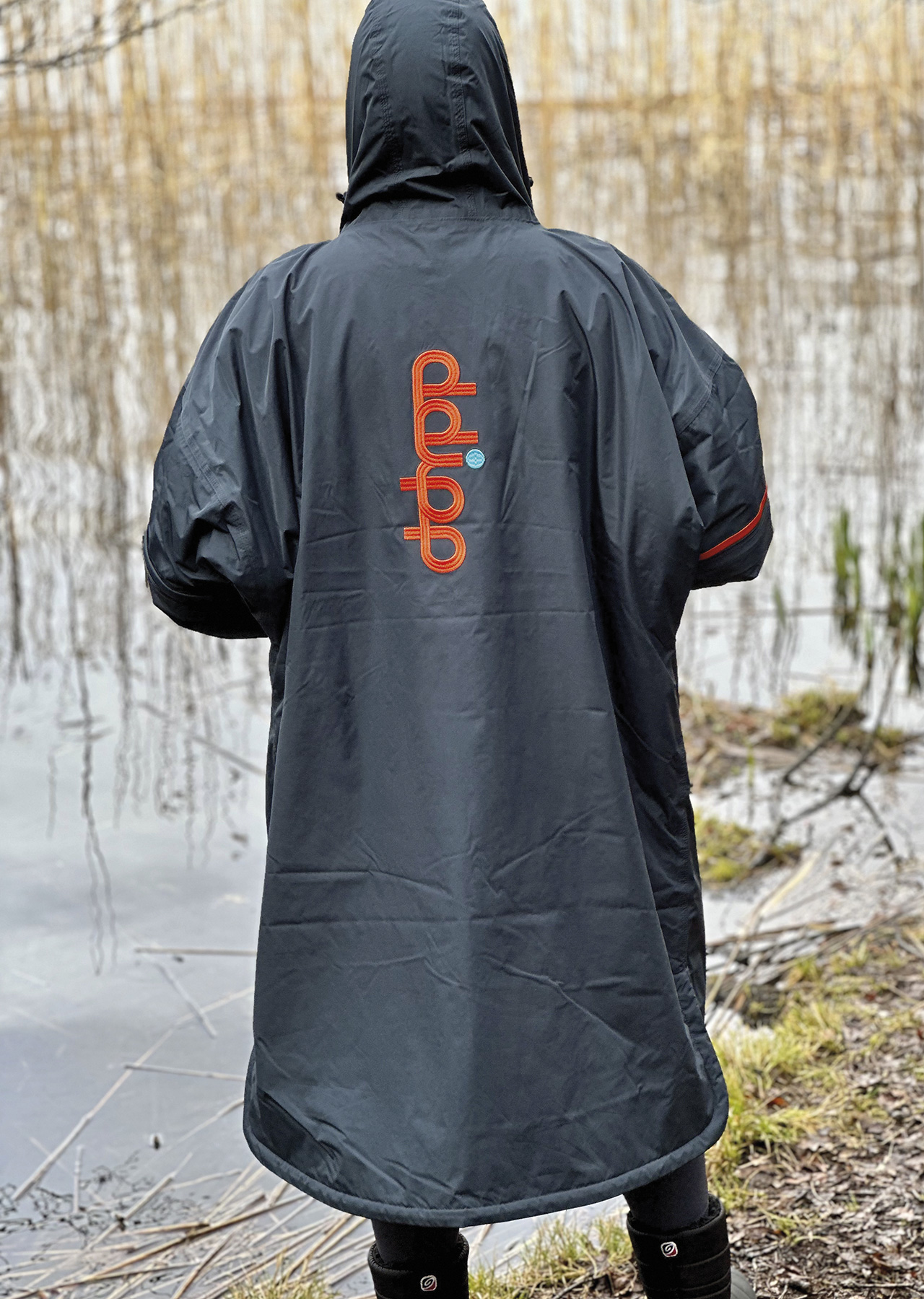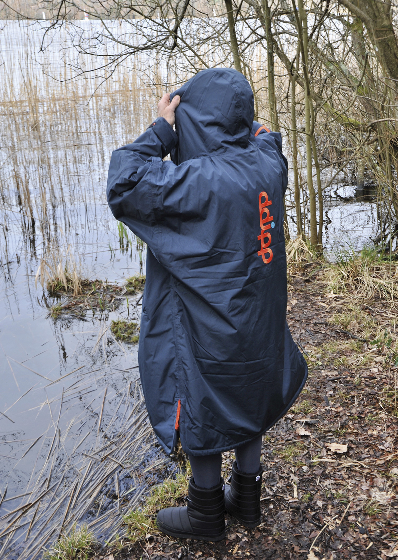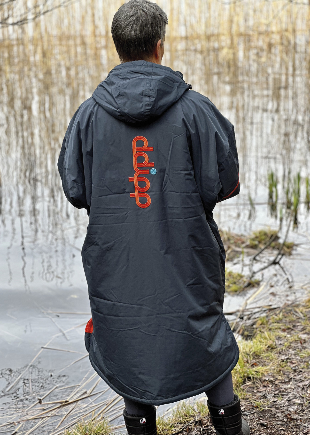 The first thing that’s apparent is the weight of the robe, coming in at only 1.1kg. The ripstop outer shell is waterproof and breathable, comes in five colours ranging from aqua to contemporary light grey, and has a waterproof rating of 5000mm. Orange is splashed about with ddipp’s cool logo on the back, front and sleeves, continuing inside with the super soft, shearling fleece lining.