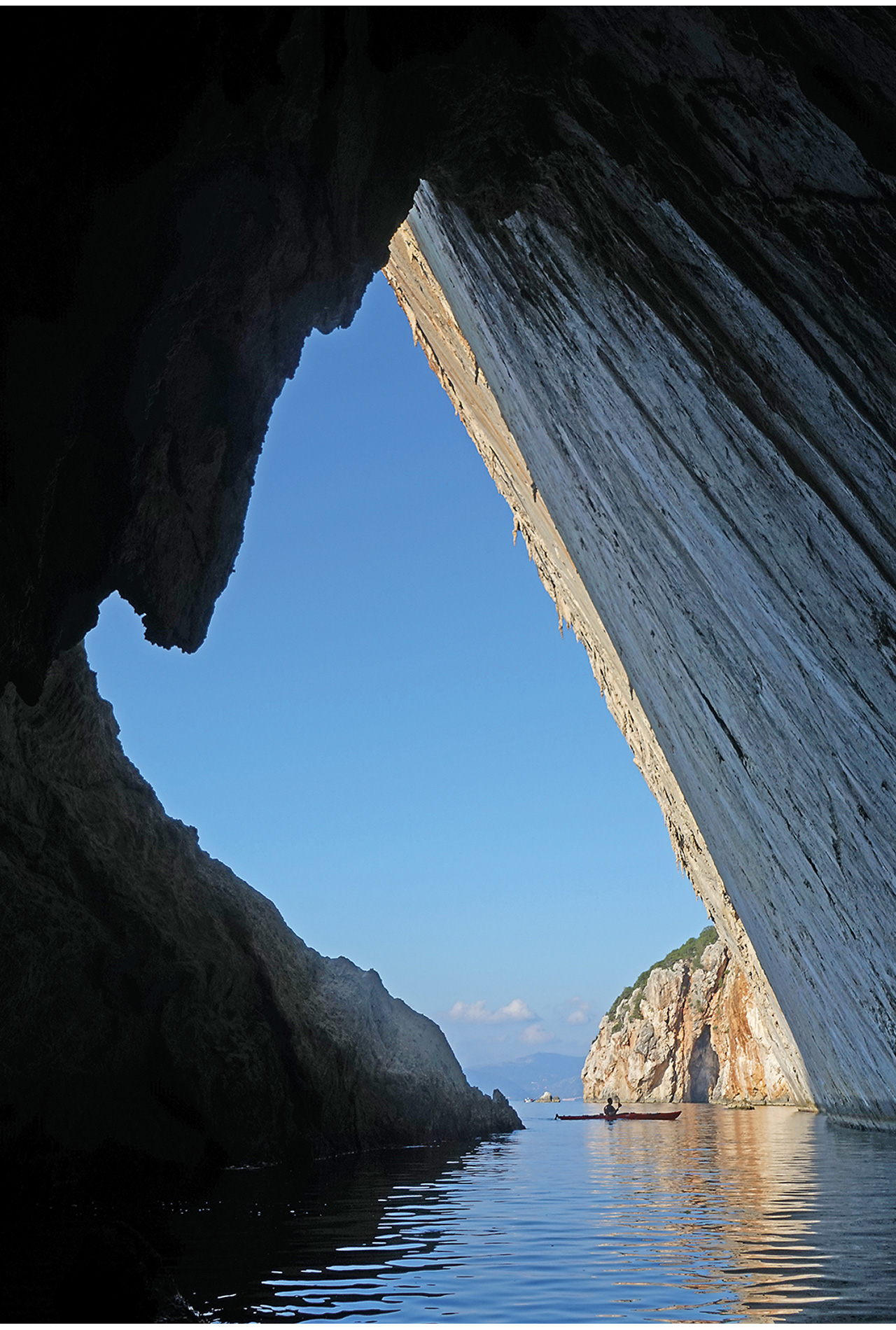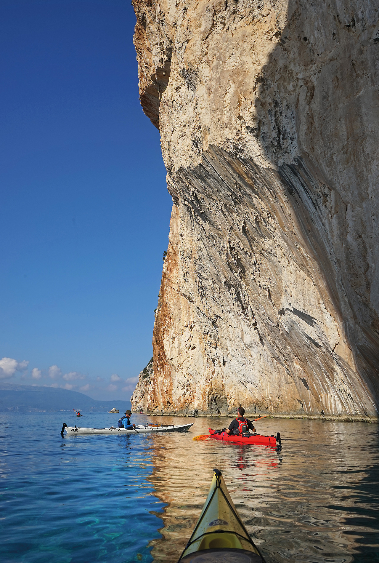 Looking at the fishermans’ boats and their wide hulls, you can see they are built to rock on the trough and ride the ridges of these fat waves. A good pilot will keep the boat on the ridge for ages before hitting a through, which is a bit hard to fully copy in a kayak but it is fun trying. For the open water crossings, we generally choose the mornings to cruise to our destinations and to ensure we have the opportunity to look at cliffs, explore the huge caves on the route, stop in coves to swim and eat and arrive before the winds catch us in the middle of the sea.