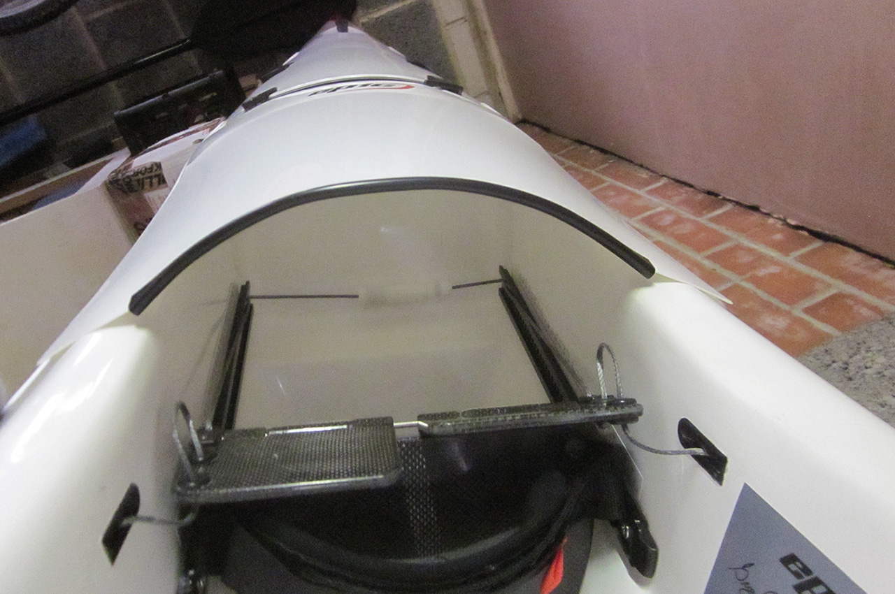 The V6 is set up in preference for tall people, therefore due to my short legs the foot boards were fully aft and when paddling water off the paddle was thrown directly into the cockpit. I recognise that this would not be a problem to most users, especially at sea, but for touring I like a dry cockpit if possible. To rectify this I made a number of trial covers for the front of the cockpit from fabric, card and plastic and finally settled for a simple 1mm polystyrene sheet hatch attached with Velcro to cover the front section of the cockpit opening back as far as the foot boards. This solved the problem and gave my V6 a dry cockpit.
