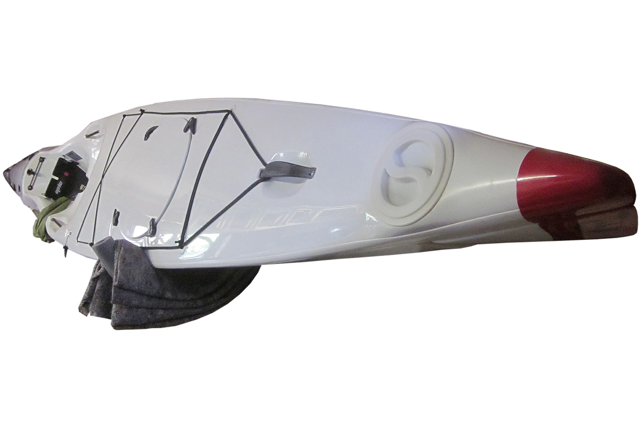 The V6 rudder system is also a major advantage over the under stern rudders of other K1s and surf skis. When paddling my K1 on the canal it has always suffered from weed build up on the under stern rudder and the bow and I needed to regularly stop and reverse to de-weed it. With the V6 the rudder system is essentially an over stern but integrated into the hull length. It can be raised via a cord and lowered under spring tension. On the canal when weed accumulates the light spring tension allows the rudder blade to flip up clearing the weed and then returning to the lowered position. The up haul cord can also be used to raise the rudder blade if any stubborn weed attaches.