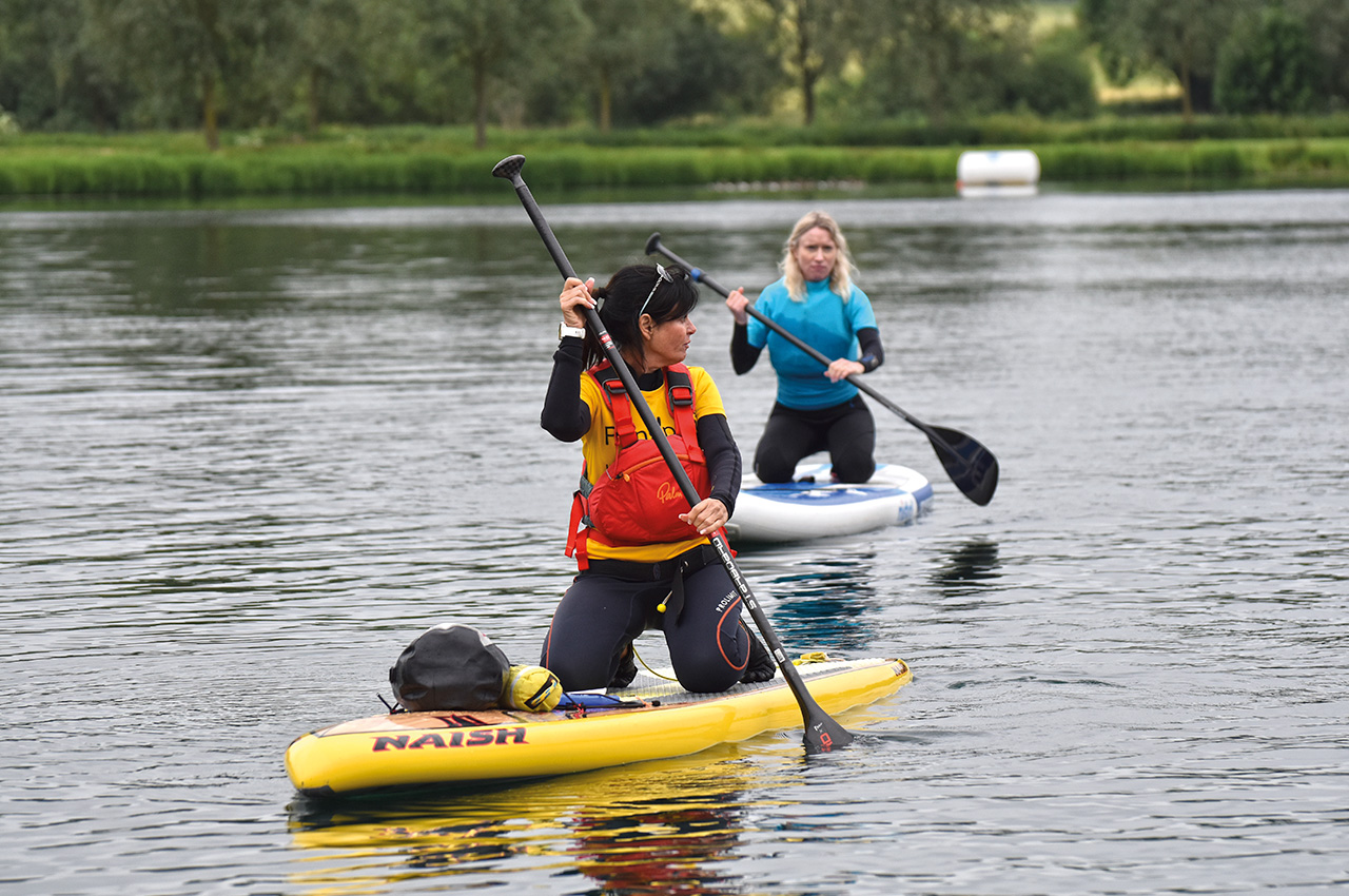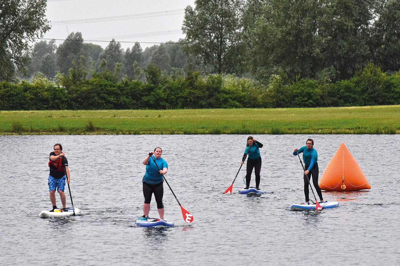 We went to visit them at their Trifarm Lake location, set just off the River Chelmer in a tranquil rural setting on the outskirts of the small town of Boreham. We watched Anni in action on the lake training first-timers, assisted by her husband Mike and Deana, another Frangipani instructor, as they went through the routines of falling off the boards and getting used to being on the water and remounting the board. The SUP novices earned their first award and collected the Ready to Ride certificate after the course finished at the on-site cafe that Anni and Mike operate.