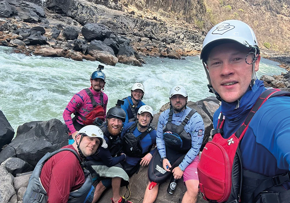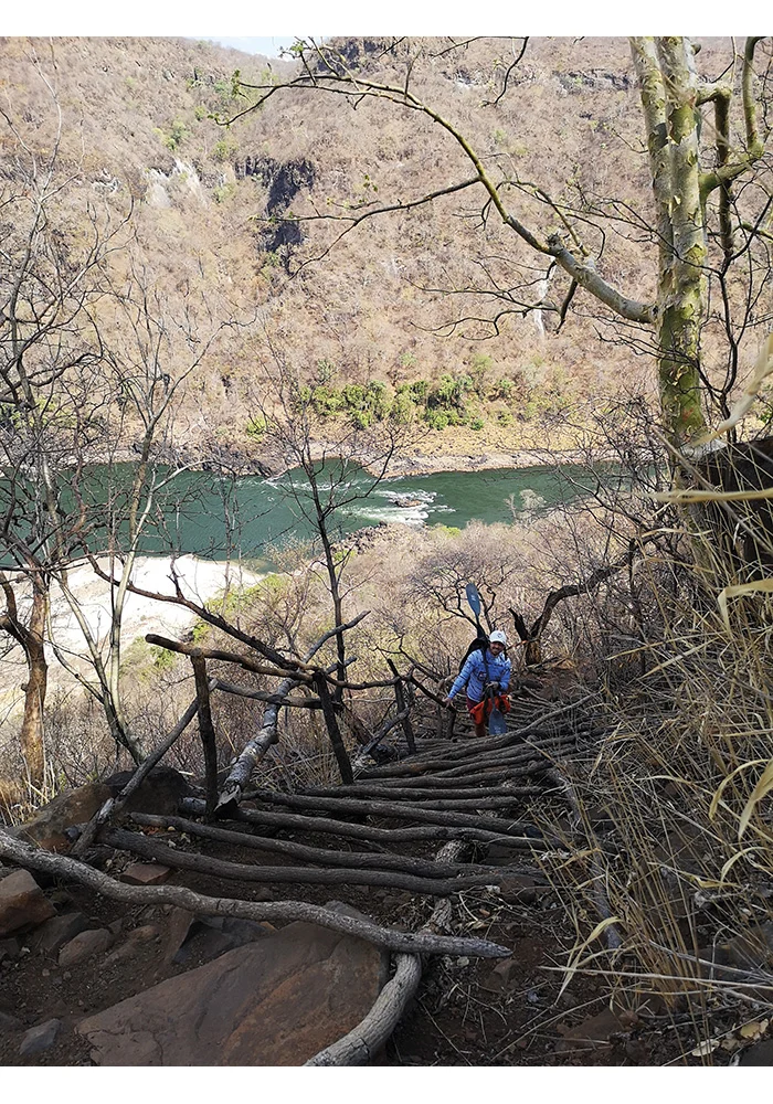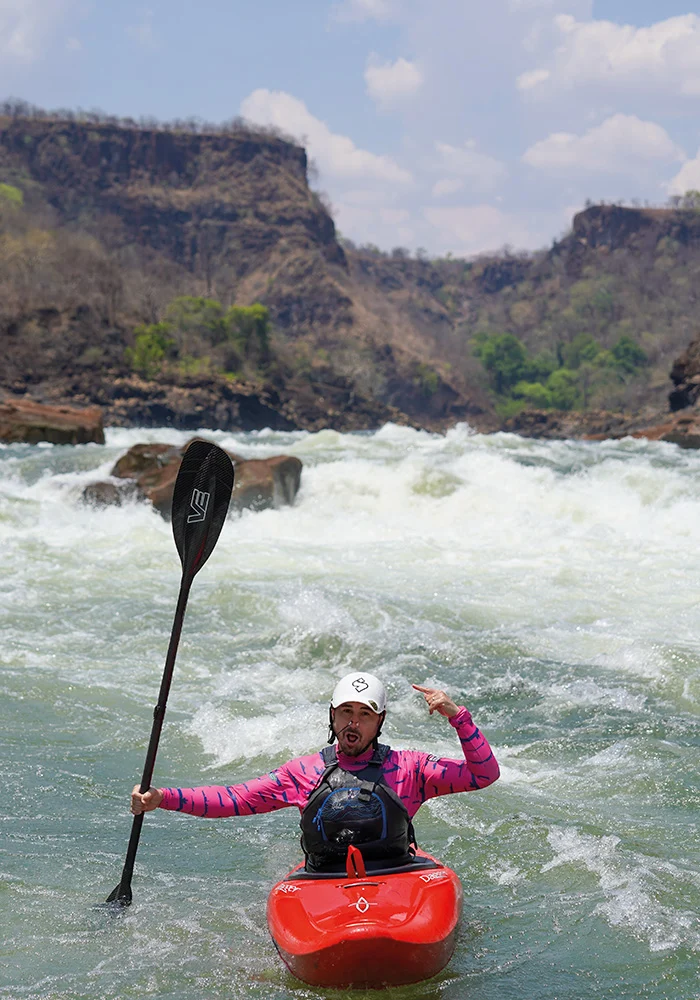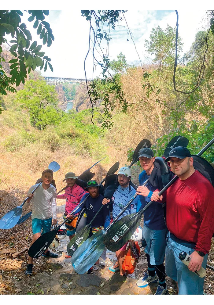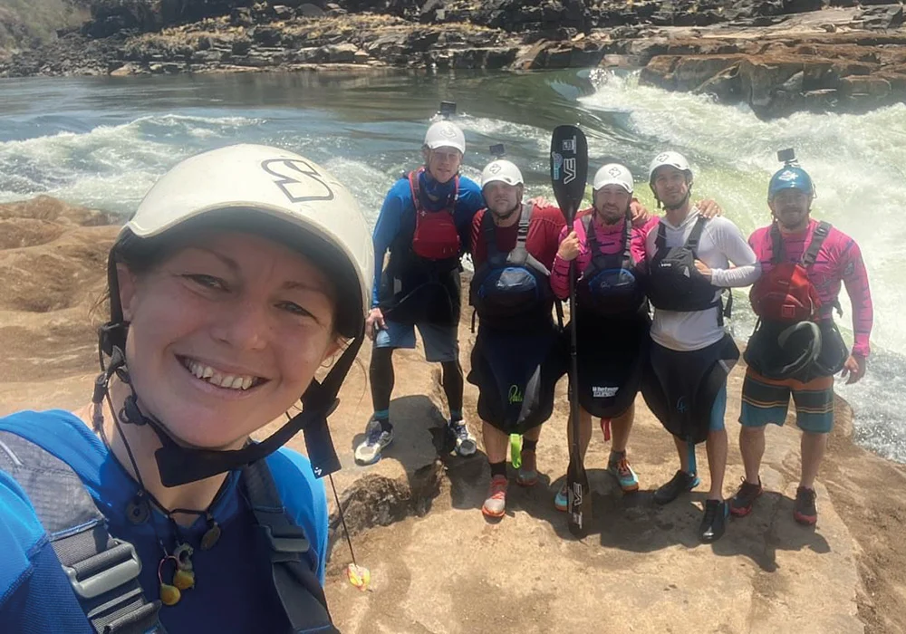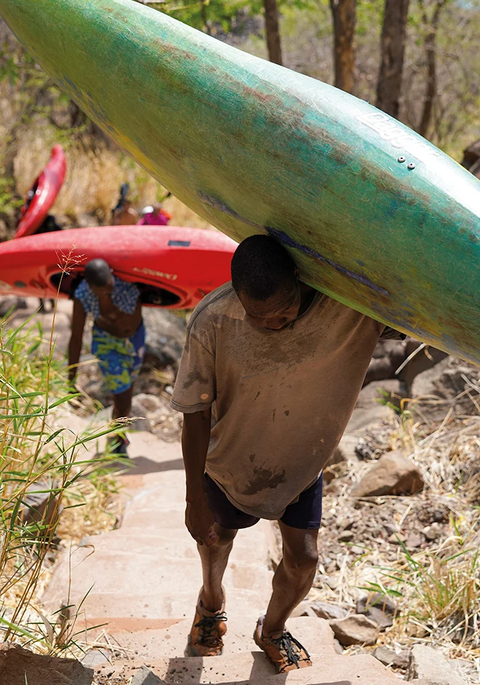 In addition to the technical demands of whitewater kayaking, the team faced the physical challenge of navigating the Batoka Gorge. Temperatures soared above 38 degrees, far beyond normal for the season, adding an extra layer of difficulty to an already gruelling expedition. The kayakers had to carefully manage hydration, pacing, and recovery to avoid heat exhaustion while navigating the fast-moving currents and unpredictable river conditions. The walks in and out of the gorge were also punishing, with steep, rocky paths and precarious wooden ladders. The team was left in awe of the local porters, who effortlessly carried multiple kayaks up the treacherous terrain – and, on one occasion, even a kayaker himself!