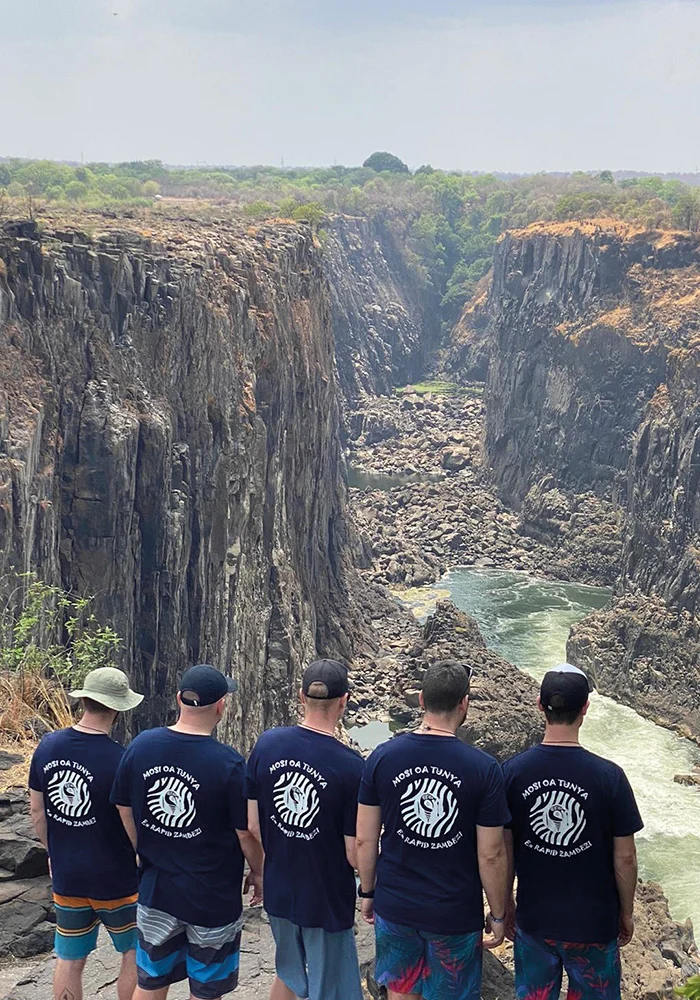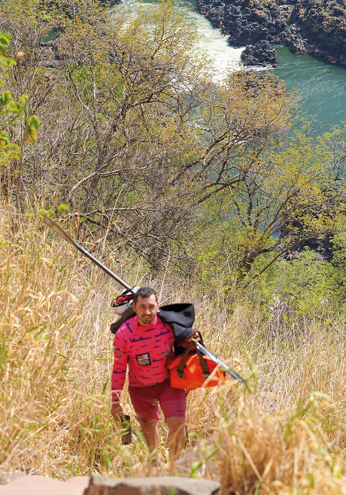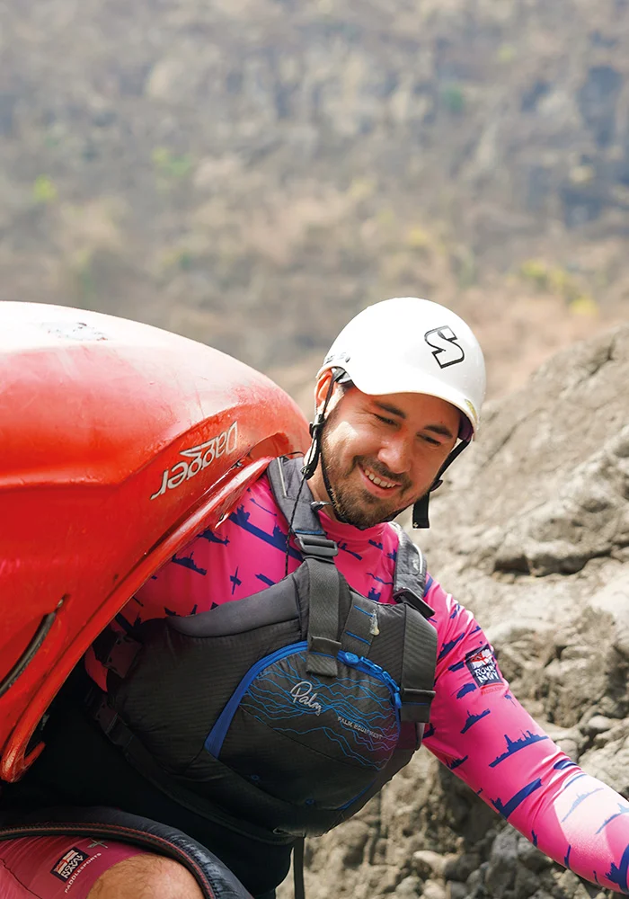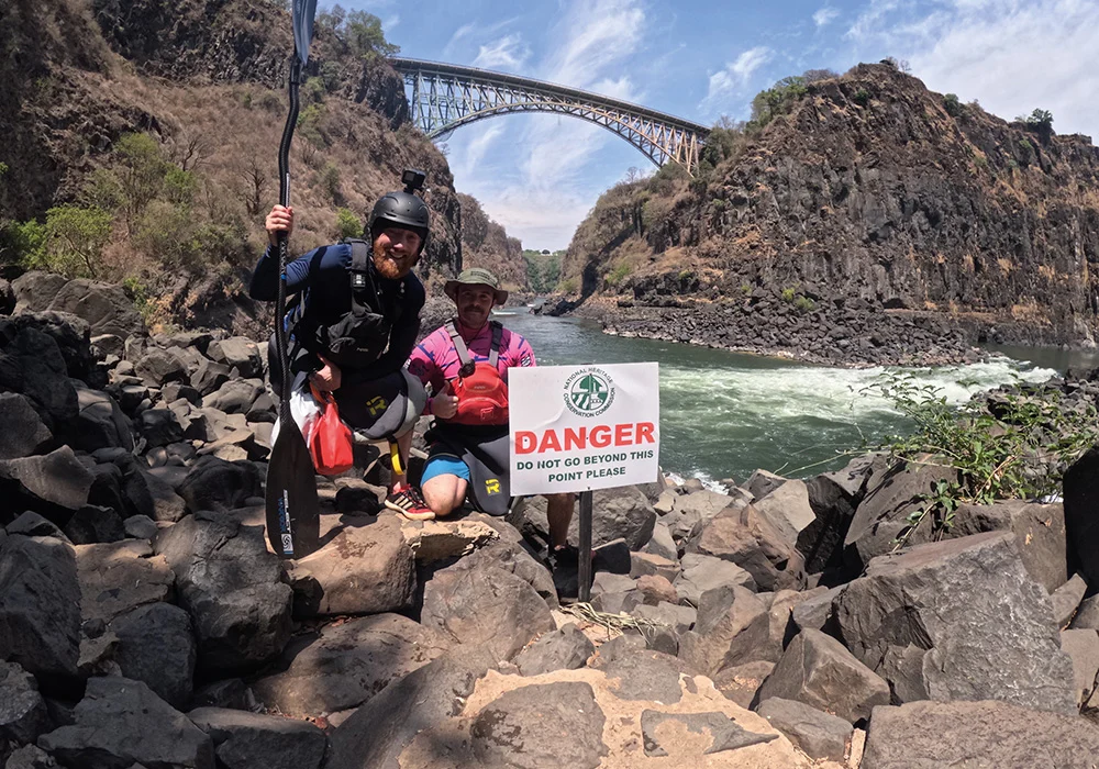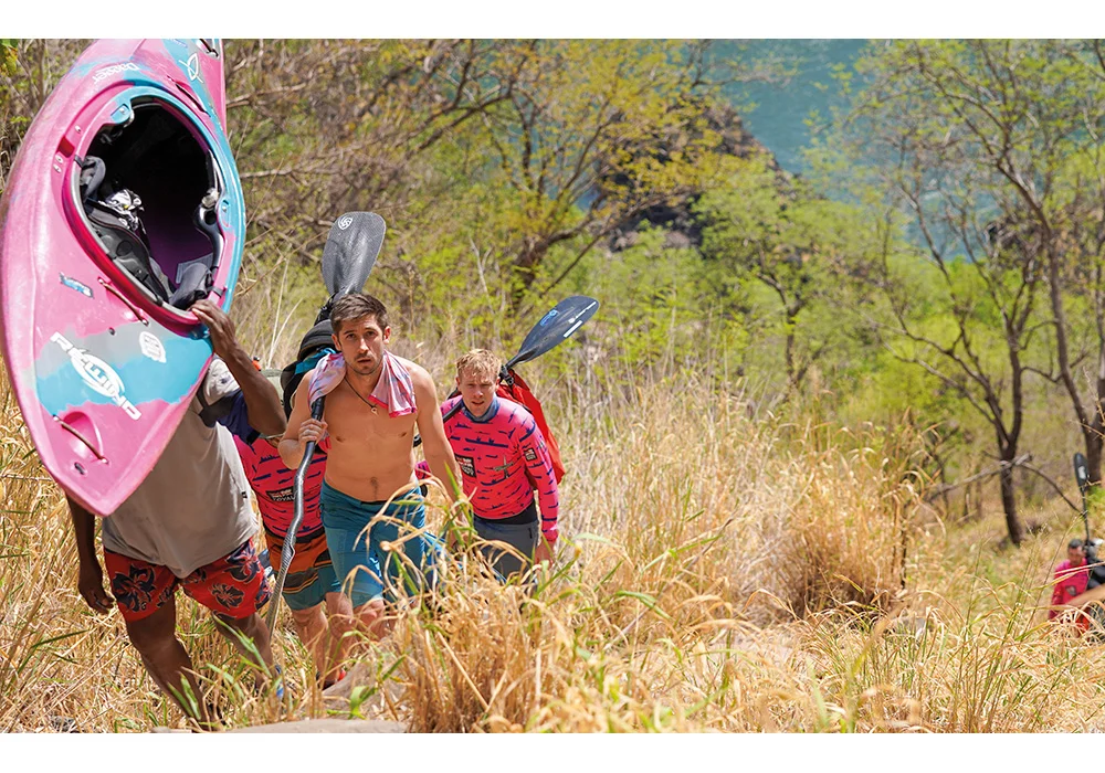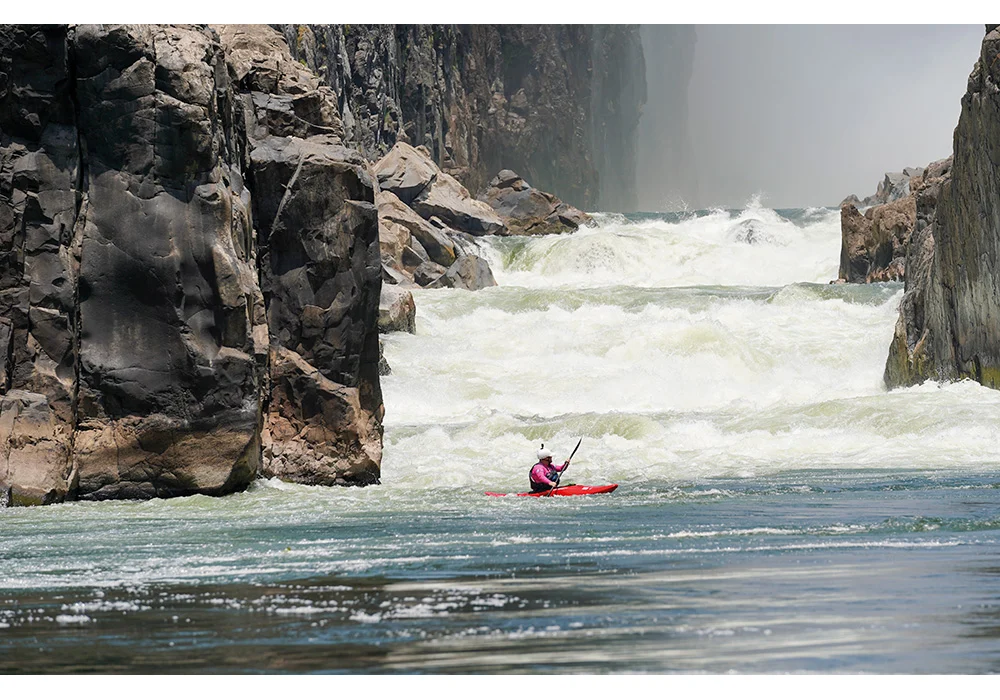 In addition to the technical demands of whitewater kayaking, the team faced the physical challenge of navigating the Batoka Gorge. Temperatures soared above 38 degrees, far beyond normal for the season, adding an extra layer of difficulty to an already gruelling expedition. The kayakers had to carefully manage hydration, pacing, and recovery to avoid heat exhaustion while navigating the fast-moving currents and unpredictable river conditions. The walks in and out of the gorge were also punishing, with steep, rocky paths and precarious wooden ladders. The team was left in awe of the local porters, who effortlessly carried multiple kayaks up the treacherous terrain – and, on one occasion, even a kayaker himself!