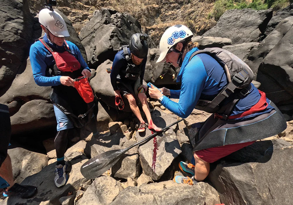 No matter how many risk assessments you write and how much preparation you put in, accidents will happen in extreme environments. On day two of the expedition, the team had to deal with just that. While scouting Rapid 4, which had some rather sizable waves and holes to navigate at low water, a team member fell and badly injured his ankle. On a Grade 3 river next to road or path access in the UK, this wouldn’t be too much of an issue, but deep in the Batoka Gorge, we knew we needed to act – fast!