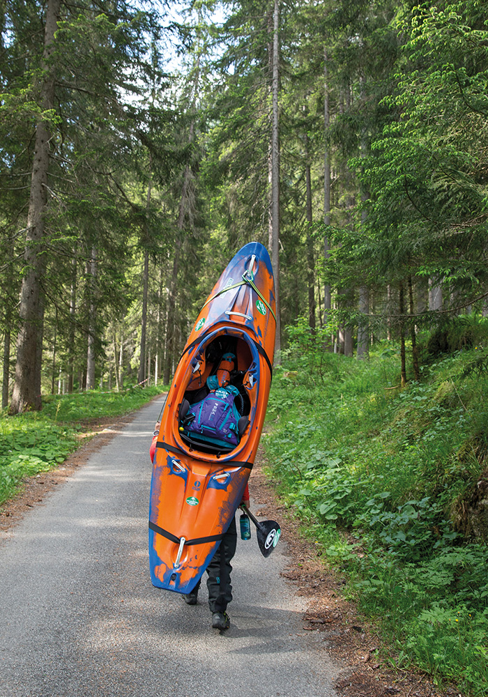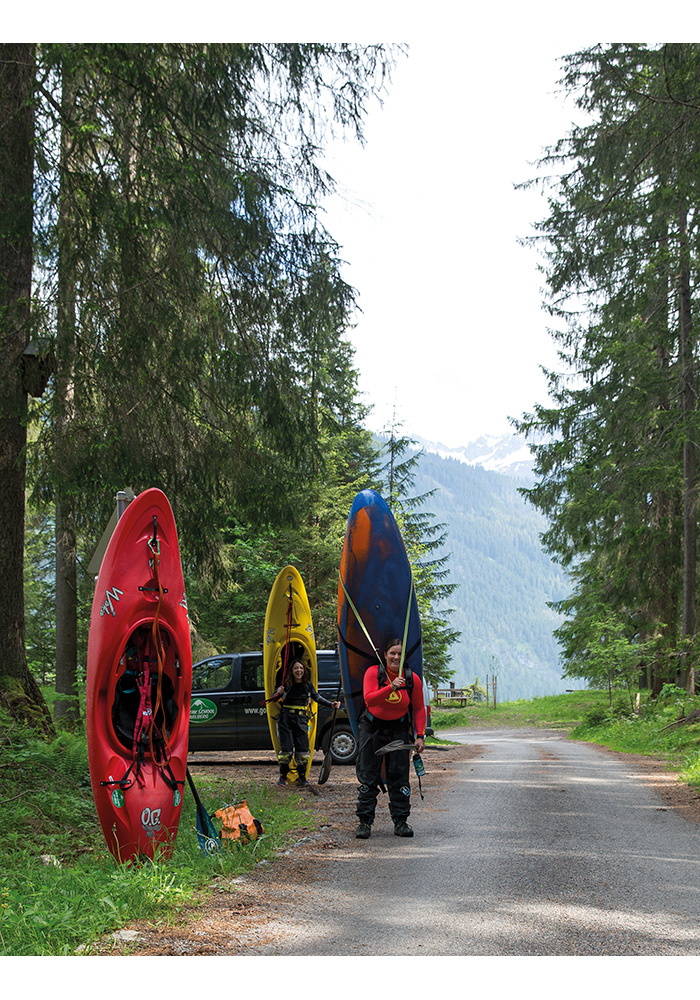 Because the river starts just over the other side of the mountains to the north of our village, we had a bit of a drive but a truly stunning one over the Arlberg Pass, into the next state of Vorarlberg and over the Flexenpass to the village of Zürs and Lech, we then followed the road that hugs the impressive Lech Gorges past Warth and then finally back into Tirol and following the River Lech to the village of Bach. Here, we turned south and drove the final part to the graveyard, and from now on, we would have to carry our kayaks five kilometres up the forest road to the put-in.
