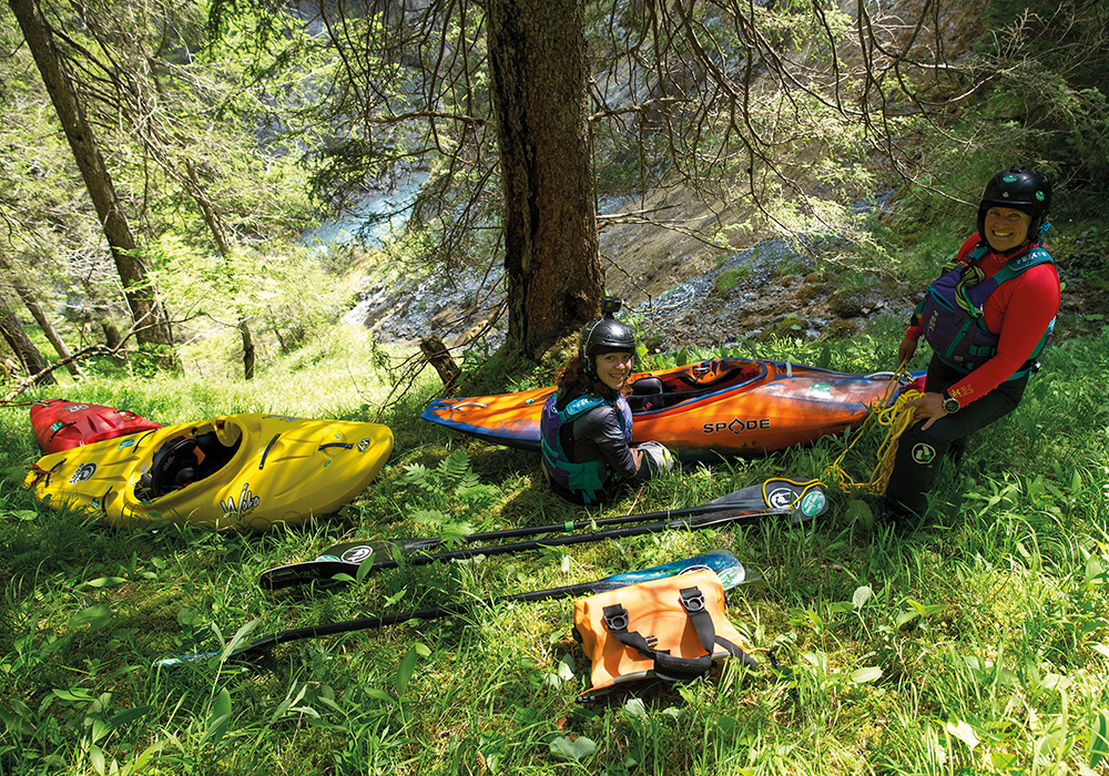 Ute has a huge smile on her face, and I laugh to myself all the while. Josefa has no idea what they are saying. At the top of the second pitch, we see a lot of wild orchids growing and flowering on the steep terrain; they are an endangered species, so while trying to avoid any damage, we continue down the second pitch, slowly but surely. It is a bit of an exposed ridge to get over with us, the kayaks and paddles before setting up another belay point for the final pitch down to the riverside. Finally, by the side of the river, we can rest, have something to drink, and start getting everything ready for the final and main part of this mini-adventure, which is the kayak down!