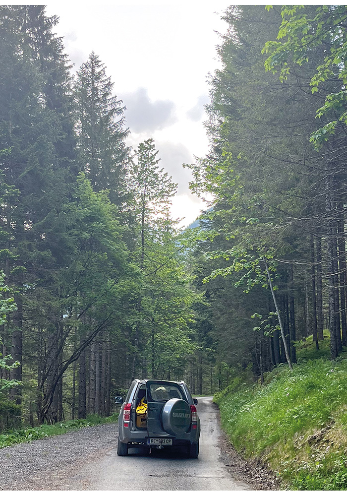 A little further upstream of the Alperschonwasserfall was a rocky outcrop by the side of the road where I could lean my kayak up against and finally take that couple of minutes break I had been promising myself the past ten corners! The forest road had great cover, but it was still hot, and sweat was pouring down me. As I was taking more gulps of water, I saw a 4×4 jeep in what we would call Hunters Green come up the road; as it got closer, I saw that the young girl sitting next to the driver looked remarkably like Josefa.