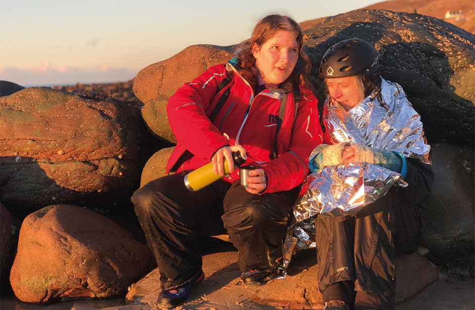 Prolonged exposure: Remove the casualty from the water horizontally if possible. Wrap them in dry clothing, sleeping bags, foil blankets, or use a group shelter. Insulate underneath (with a foam pad, drybag or rafted boat) to prevent heat loss through conduction. Rewarm passively; avoid direct heat to limbs or rapid handling. Offer warm sugary drinks only if they are alert and able to swallow. If they are unconscious or shivering has stopped, assume severe hypothermia and call for emergency help immediately.