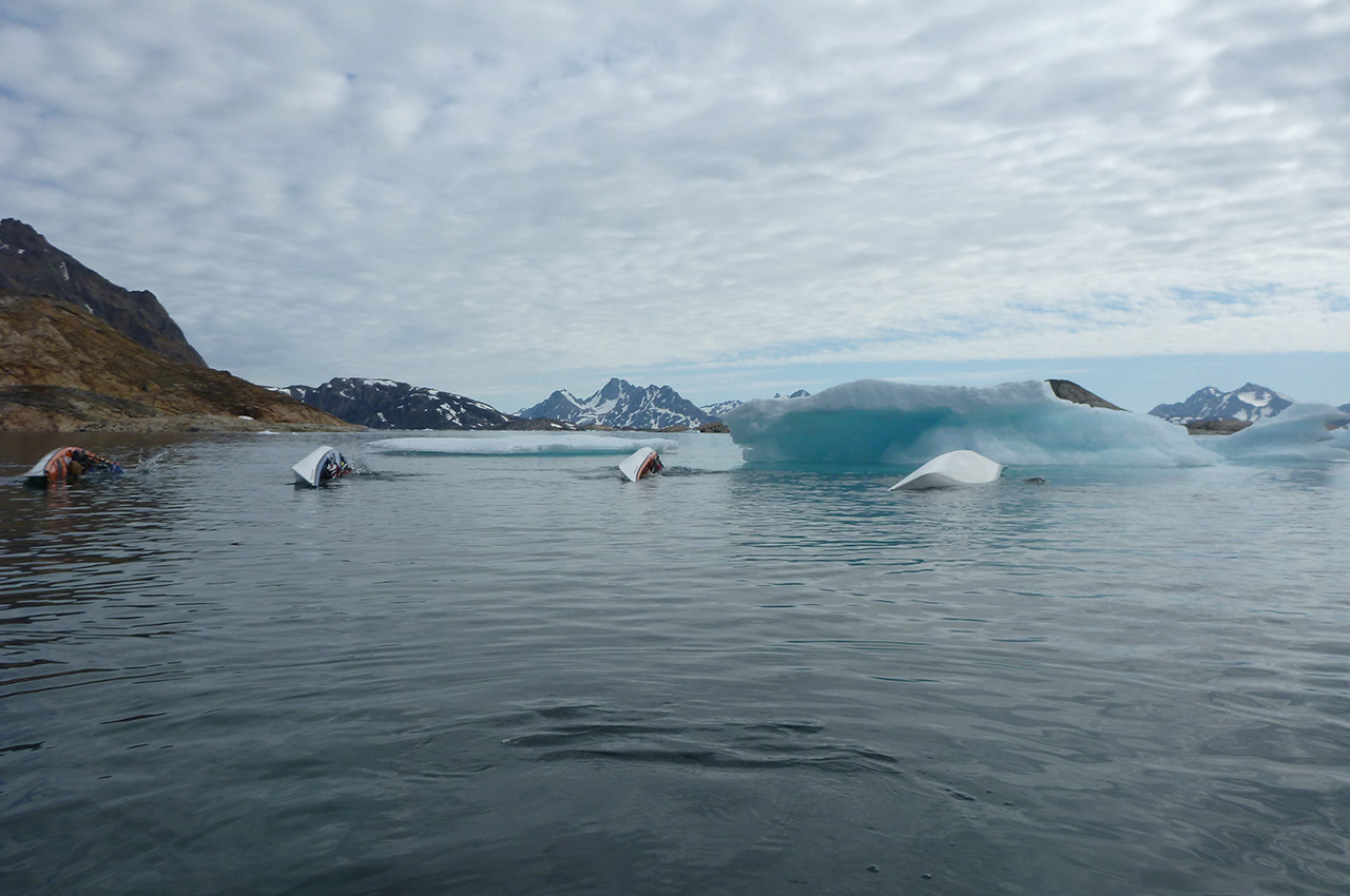 We set out at a steady pace and in close formation easing ourselves into the day. At about the midpoint, the fog rolled in very thickly; first, we lost the tops of the mountains, then the distant shoreline. Large bergs started to melt into the fog, and visibility was down to no more than 50 metres within a very short time. We certainly all felt we were on for a real adventure.