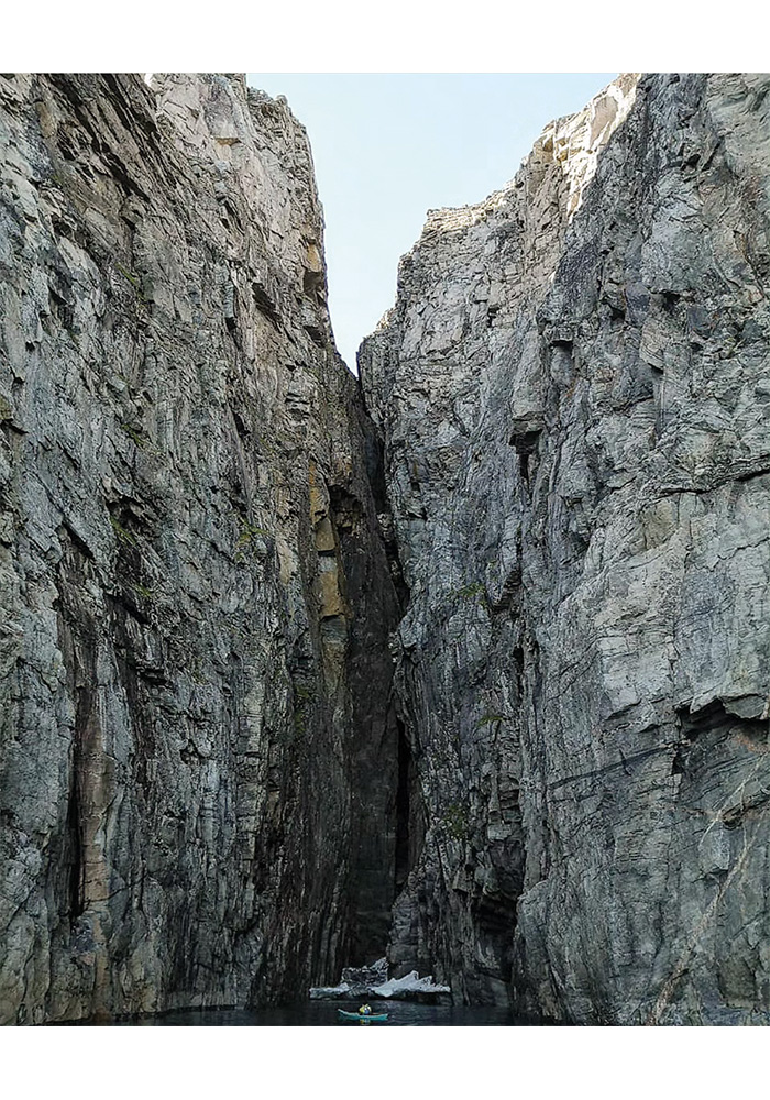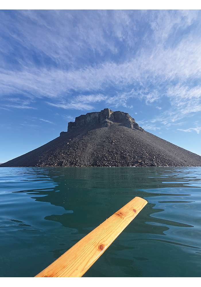 I could see the island I was heading to for hours before reaching it – sometimes hidden behind icebergs, it popped in and out of view over the course of the day, always aggravatedly seeming the same size, and it felt like I wasn’t closing the distance at all, not until the last kilometre, when it increased rapidly in size, that I realised just how high it was (pictured!) – an incredibly dramatic gash from top to bottom that I could qajaq right into, beautiful clear waters where you could see the continued descent of the rock into the depths. At this point, I was about 75km from any other land and, rather disappointingly, the rock plunged directly into the sea with no chance of a landing, let alone a camp spot.