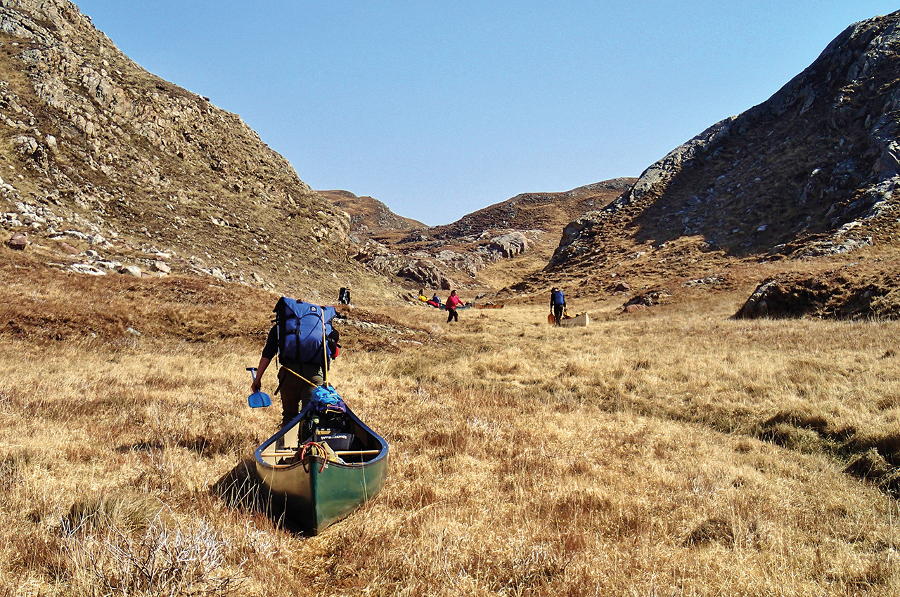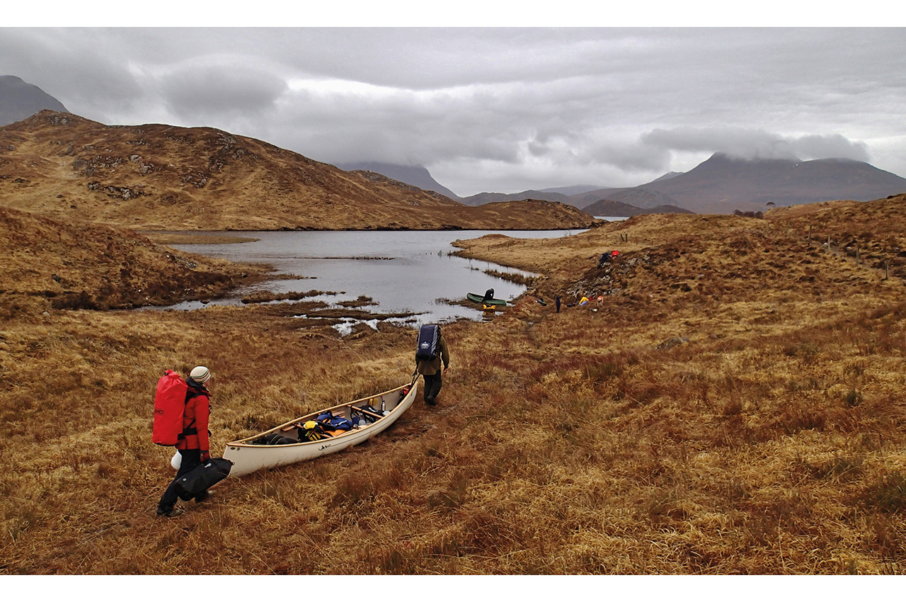 The return the following day was even harder work. It was uphill to Fionn Loch. The sun was shining, and after an early start we broke for breakfast at a ruined croft, before commencing the main part of our portage. For some reason, this was a brilliant day. As we battled along, the group straggling out over the moorlands, a sense of how ridiculous this was made it great fun. At times, there were bags, boats and kids strewn across the landscape, but not a drop of water was visible, just heather and bogs.