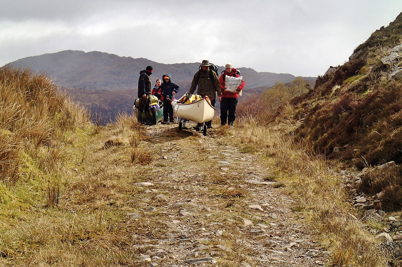 We spent a couple of days on an aborted attempt to portage to Fionn Loch, 4 kilometres to the north of Loch Maree. Using trolleys to portage up gravel tracks, we were making reasonable progress, though it was extremely hard work, when there as a loud bang. One of the trolley tyres had exploded, both inner tube and outer, and couldn’t be repaired. We had no choice but to return. Again, though, nobody minded, it was a lovely day, and we spent another 4 hours pushing back to Maree, after two days taking canoes for a walk for no reason.