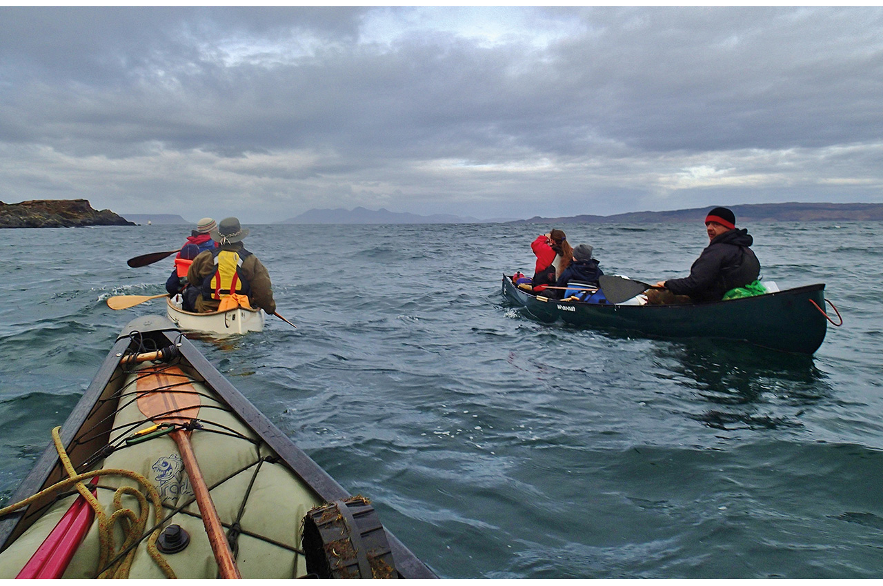 With a sense of relief, but also of great accomplishment, we found water once more, and put in, after five hours of hard work, onto a bay of Loch Veyatie. The wind was rising and, remarkably, it was behind us. This meant we could raise a sail, and, rafted together in one happy group, we enjoyed a remarkable voyage to end our trip.