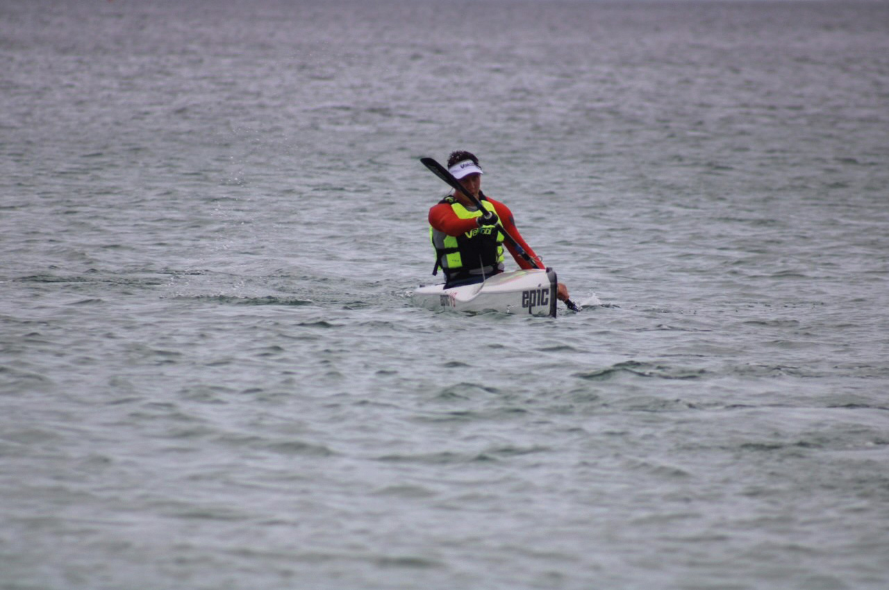 Having done DW, I started entering the Hasler marathons. Jim grabbed me at the Tamar race and said that I was doing well, but I would enjoy the surfski more. So we hatched a plan that I would do Epic Bay in 2019, and If I could do two laps, then I would do the Icon. Time was tight, though. Jim and I met in the yard to set up a V5 and some suitable prosthetics. He was a bit nervous as I told him to get his angle grinder out and cut feet and shin tubes. Then the Thursday evening before the race, Jim and I went to Exmouth with Dave, who would be my escort paddler. We worked out how to launch me, how to recover me and whether I could steer. Back then, recovering me onto my ski involved rope lines and paddling with a paddle float in my cockpit. Thankfully it has all got a bit simpler now – essentially, I do it the same way as everyone else, just a bit more slowly and with someone steadying my boat if conditions are rough.