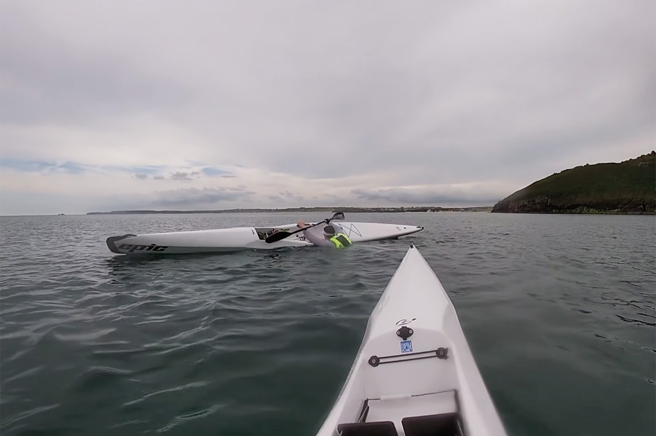 I swore a lot. Somehow I didn’t swim. Dave, my escort paddler at the final headland, had a swim and was struggling to remount. He was behind me, and it was all I could do to keep myself upright; I couldn’t assist him. I waited around until I saw the safety rib come to help him, then I decided my best move was to crack on as I could see the clearer waters ahead, so I finished the race alone. When Jim met me at the beach and helped out the boat, I told him I was a bit out of my depth. He said to keep that quiet as I had done it!