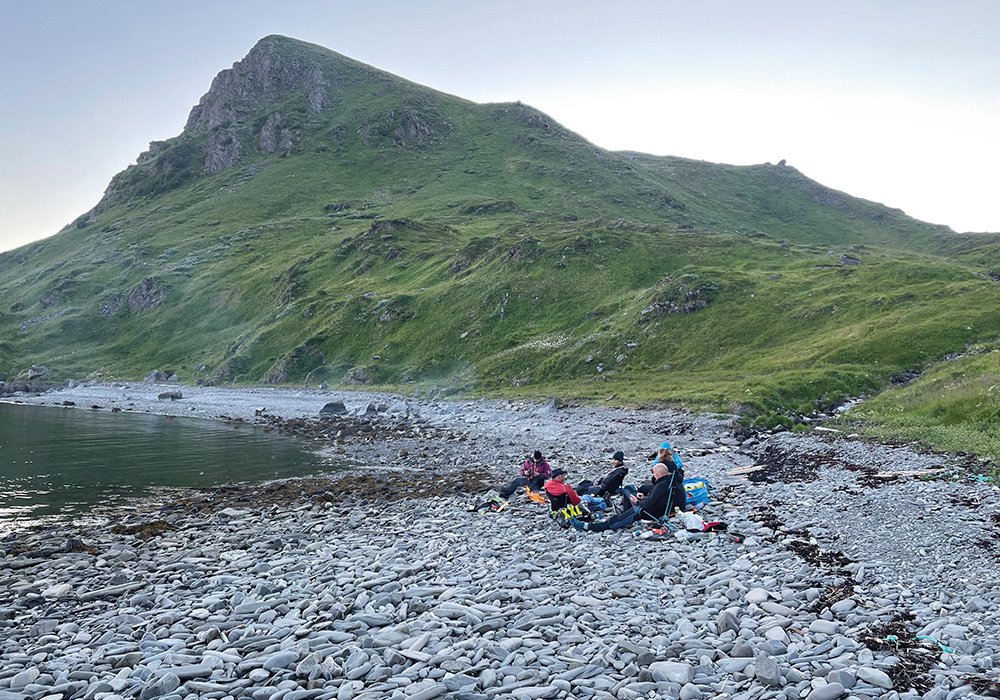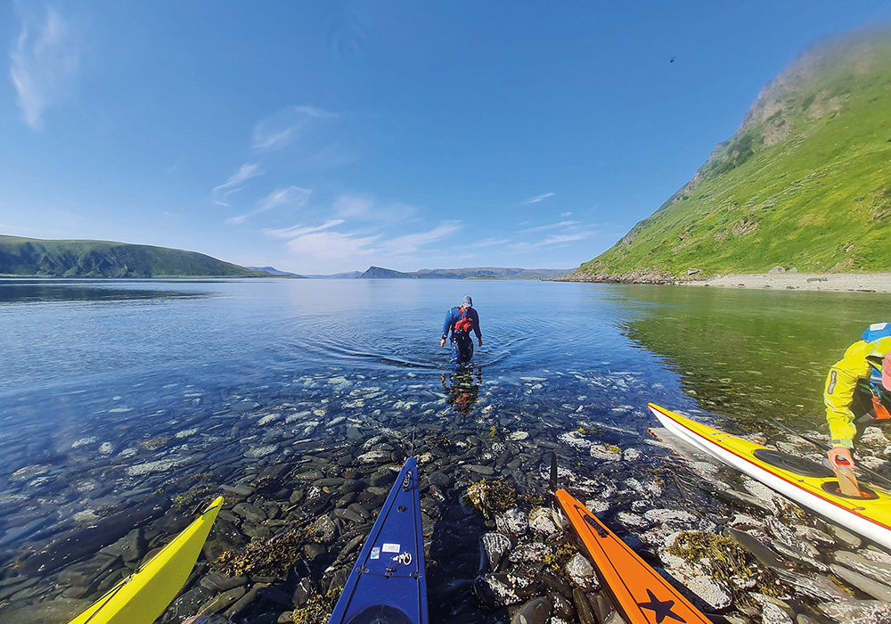 Timing was everything. We aimed to pass Helnes at slack tide when currents were at their weakest. Still, we encountered significant waves of around two meters and swirling eddies. After paddling through confused seas, we reached calmer waters and landed at Kjeldvika for lunch. This isolated bay has no road connection, but there are still a handful of cottages used by the locals.