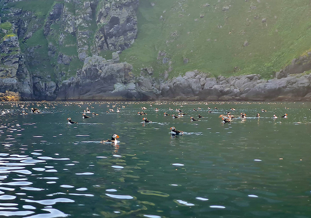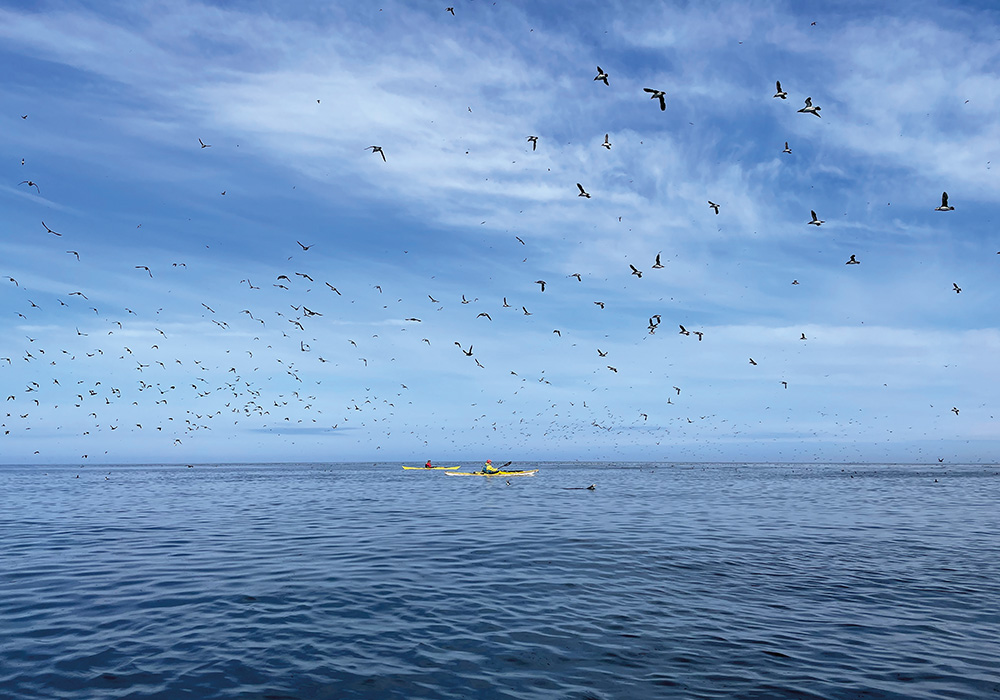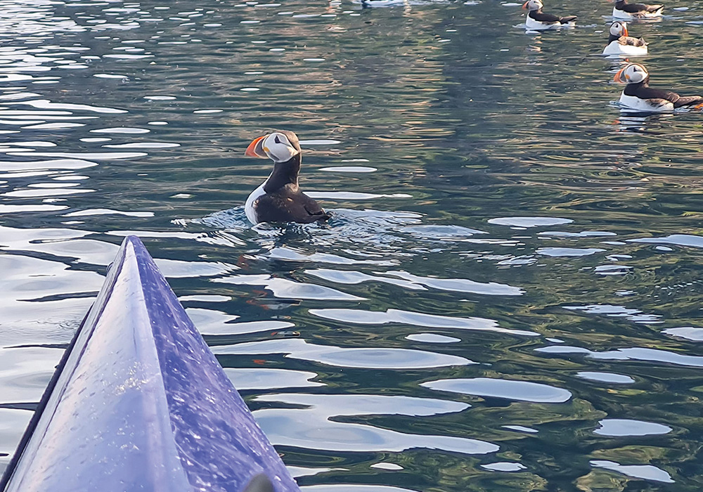 Further along, we reached Gjesvær, a picturesque fishing village with around 80 residents. This small-scale fishing is noted in old Viking documents from 1225 as a trading harbour and fishing village. The village was without a connecting road until 1976. This in itself is a testament to the importance of the sea to the local populace. Just offshore lies Gjesværstappan, one of Norway’s most spectacular seabird cliffs. Over a million birds nest here, including puffins, gannets, guillemots, cormorants, and Sea Eagles. Paddling close to the cliffs, we watched thousands of seabirds swooping overhead and diving into the water to catch fish. Stappan is a protected nature reserve, and respecting the wildlife is essential to preserving this unique ecosystem.