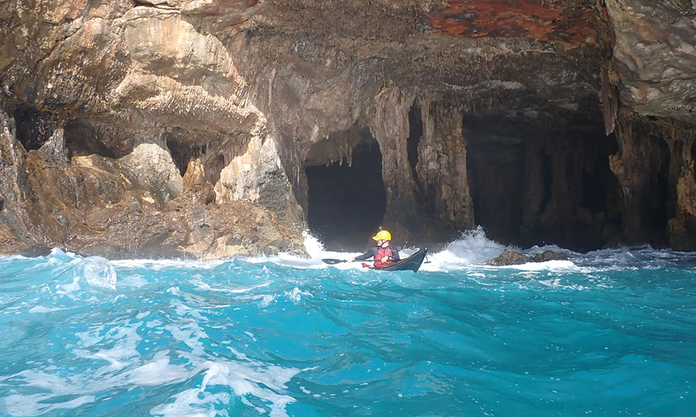 Once inside, the water often glows a distinct, vibrant turquoise, illuminated by sunlight filtering in from underwater openings. Some are calm places to rest; others, exposed to the swell, require timing and trust in your skills as the sea breathes in and out of the rock. Exploring them is a mix of geology and adrenaline – finding your way into the dark and turning back to see the blue light of the exit.