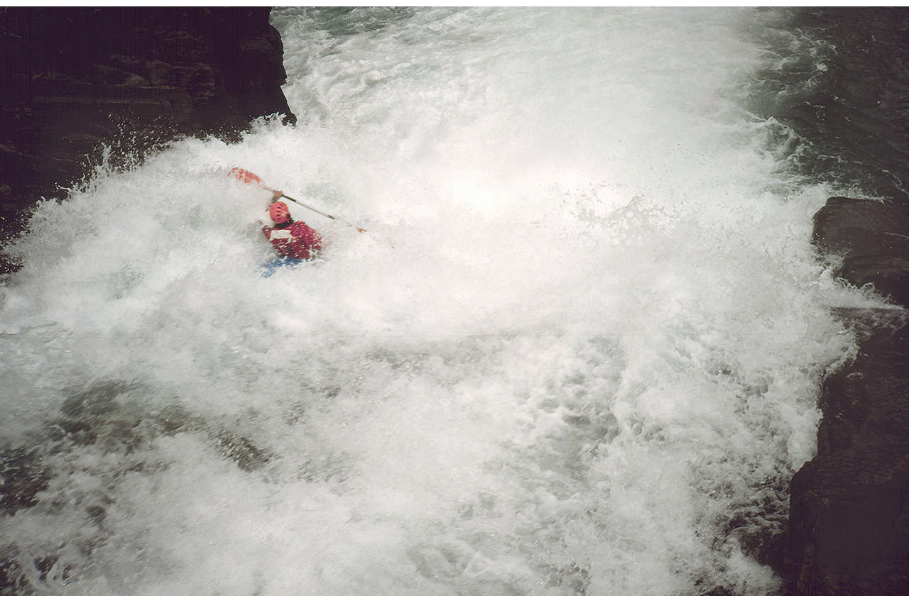 I launch from the eddy and force a way into and across the swiftly moving water; large standing waves hide the route – but over them, as the gradient steepens, I aim left of middle, steeper again, over a slight bulge in the waves and its free fall for what seems like ages.