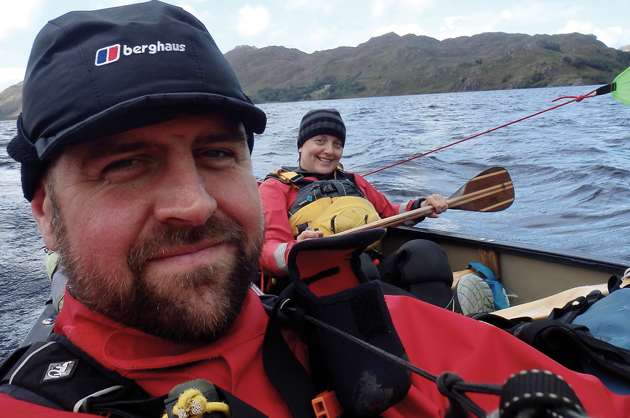 We arrived at Loch Lochy at the end of a physically and mentally draining day. I was riddled with midge bites and somewhat to Adam’s concern, my face had started to swell up. Bearing in mind that I didn’t have to contend with looking at my bitten and swollen face. I was more concerned with the discovery that one of my kneepads had vanished. I adopted the ’adapt, improvise and overcome strategy’, constructed a woolly hat and bungee cord knee-protector and we got back on the water.