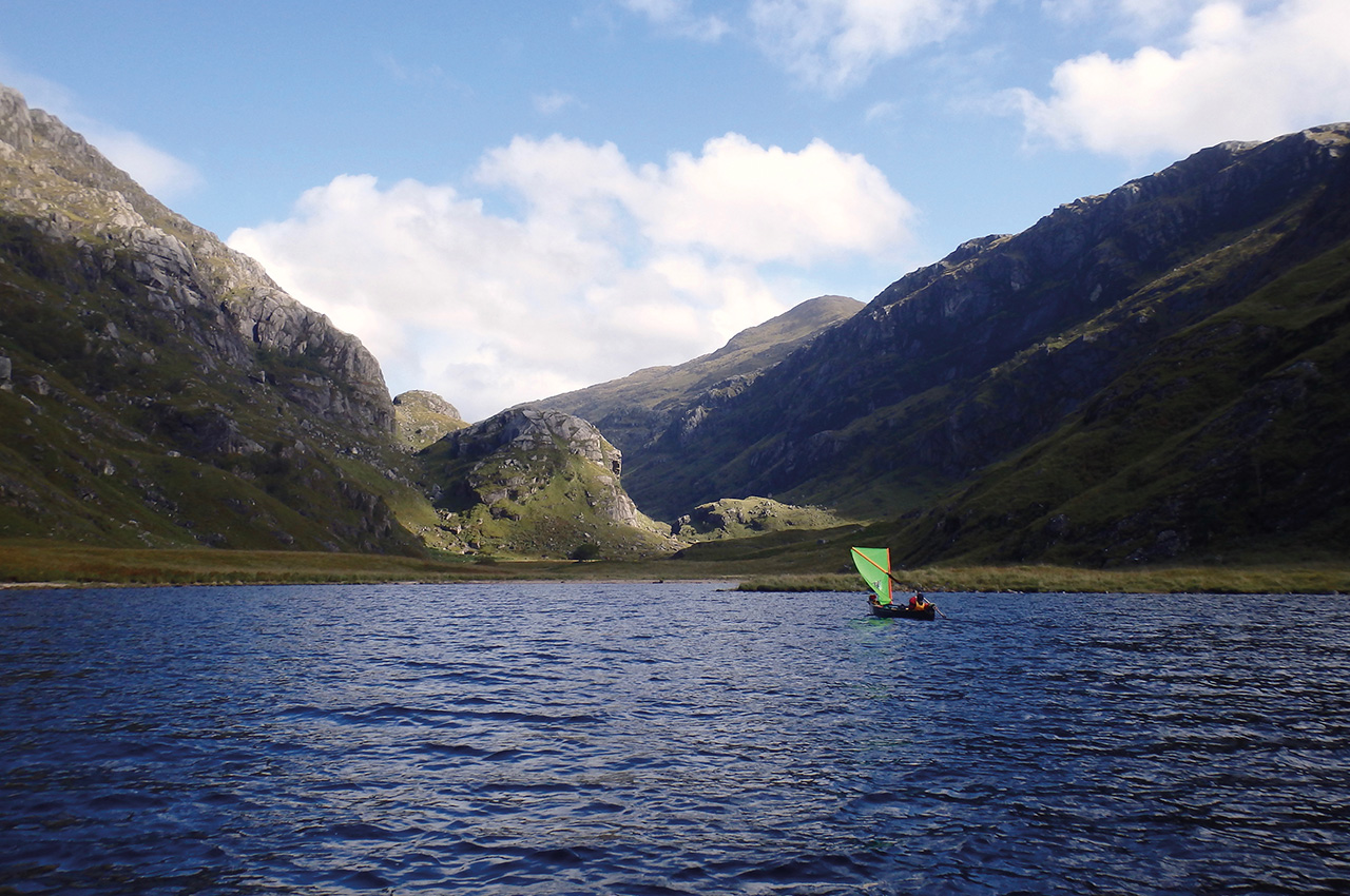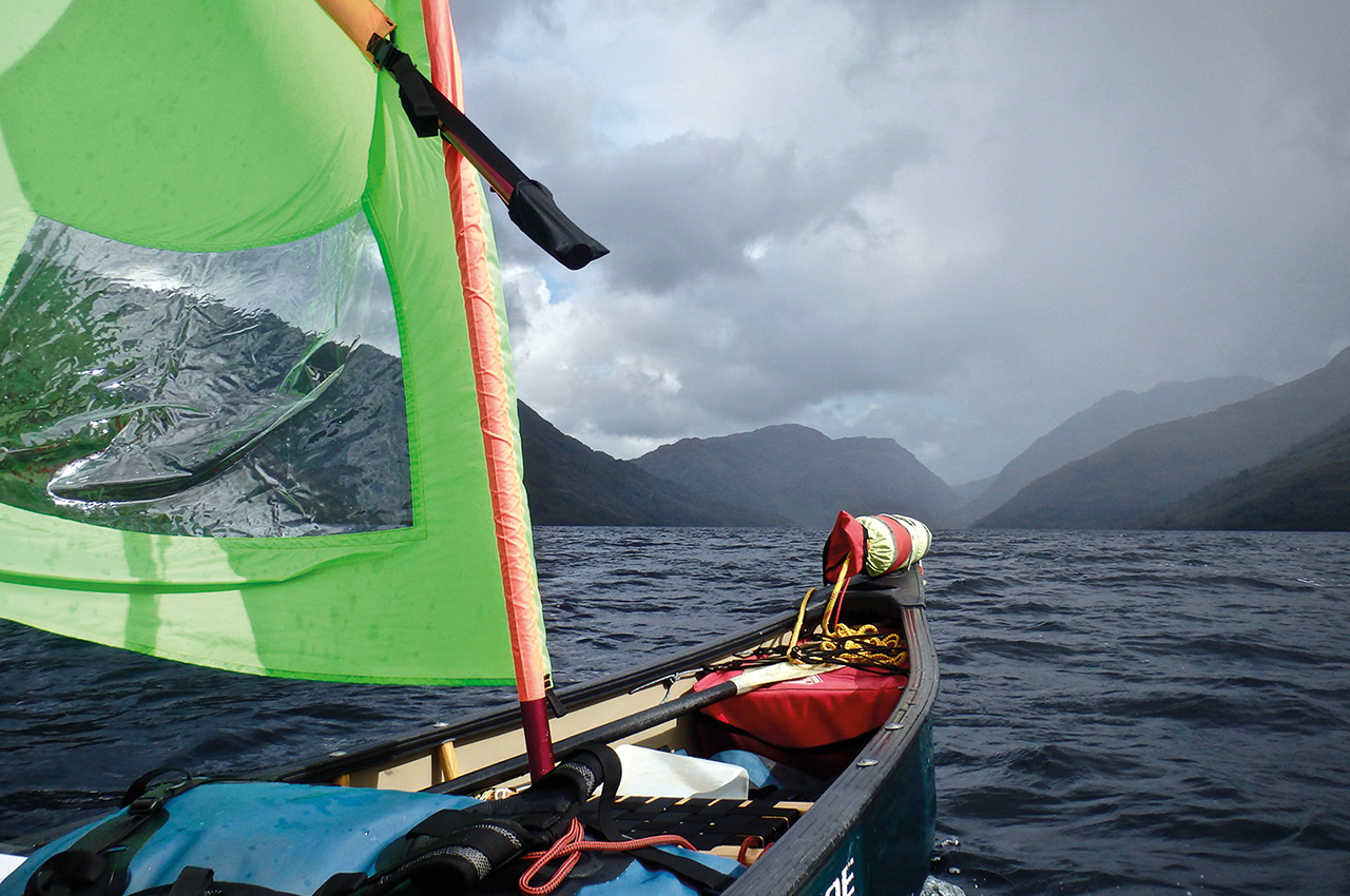 A hearty breakfast provided a deep calorie upload and we continued preparation. On previous expeditions, we had one large and one smaller portage bag but this time, we were pretty ruthless with what we took. We set off from the jetty at Loch Morar in dull and drizzly conditions. We paddled a little way and then the wind picked up to an easy F2-3 so we quickly set up our sails and cruised steadily to the end of the loch.