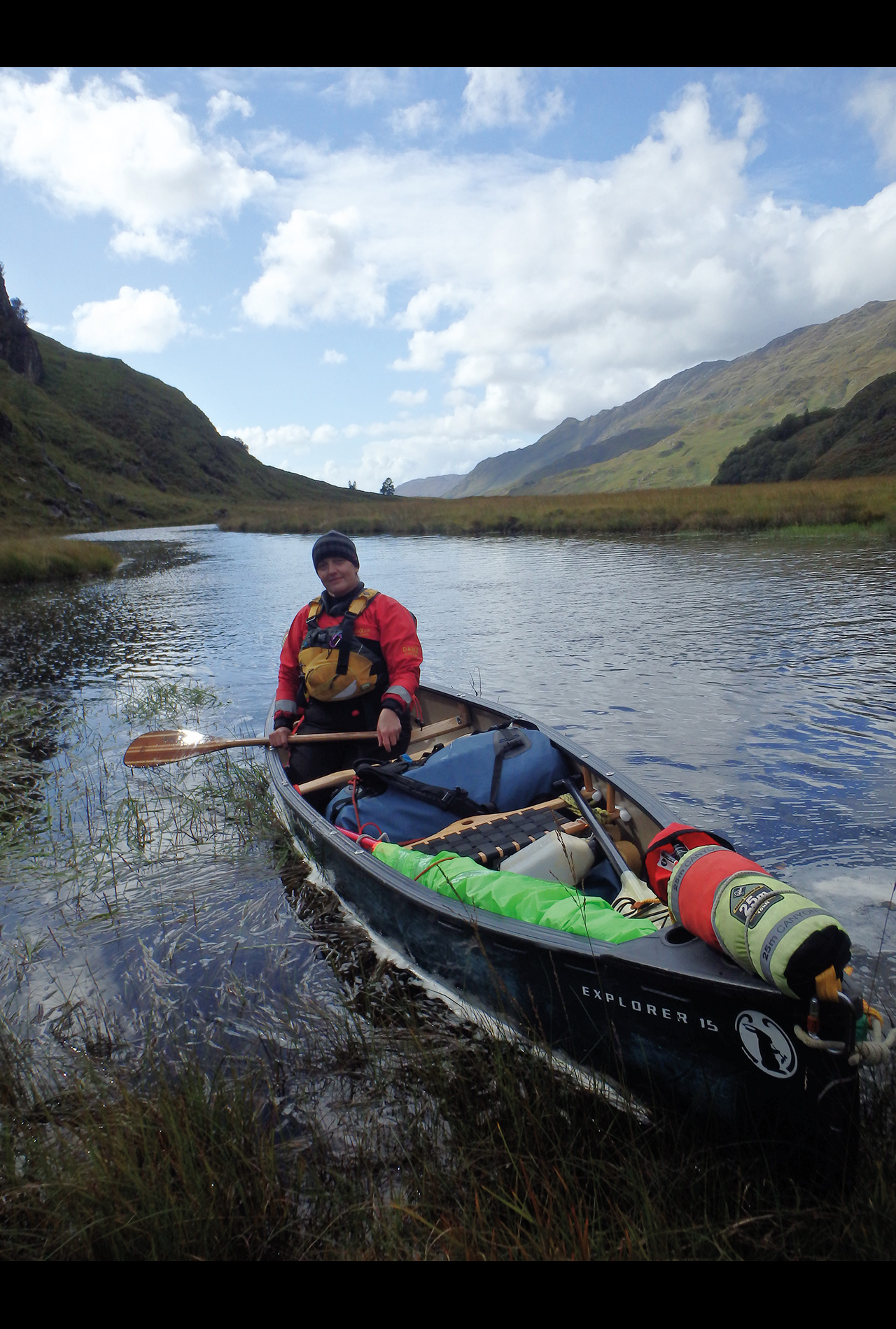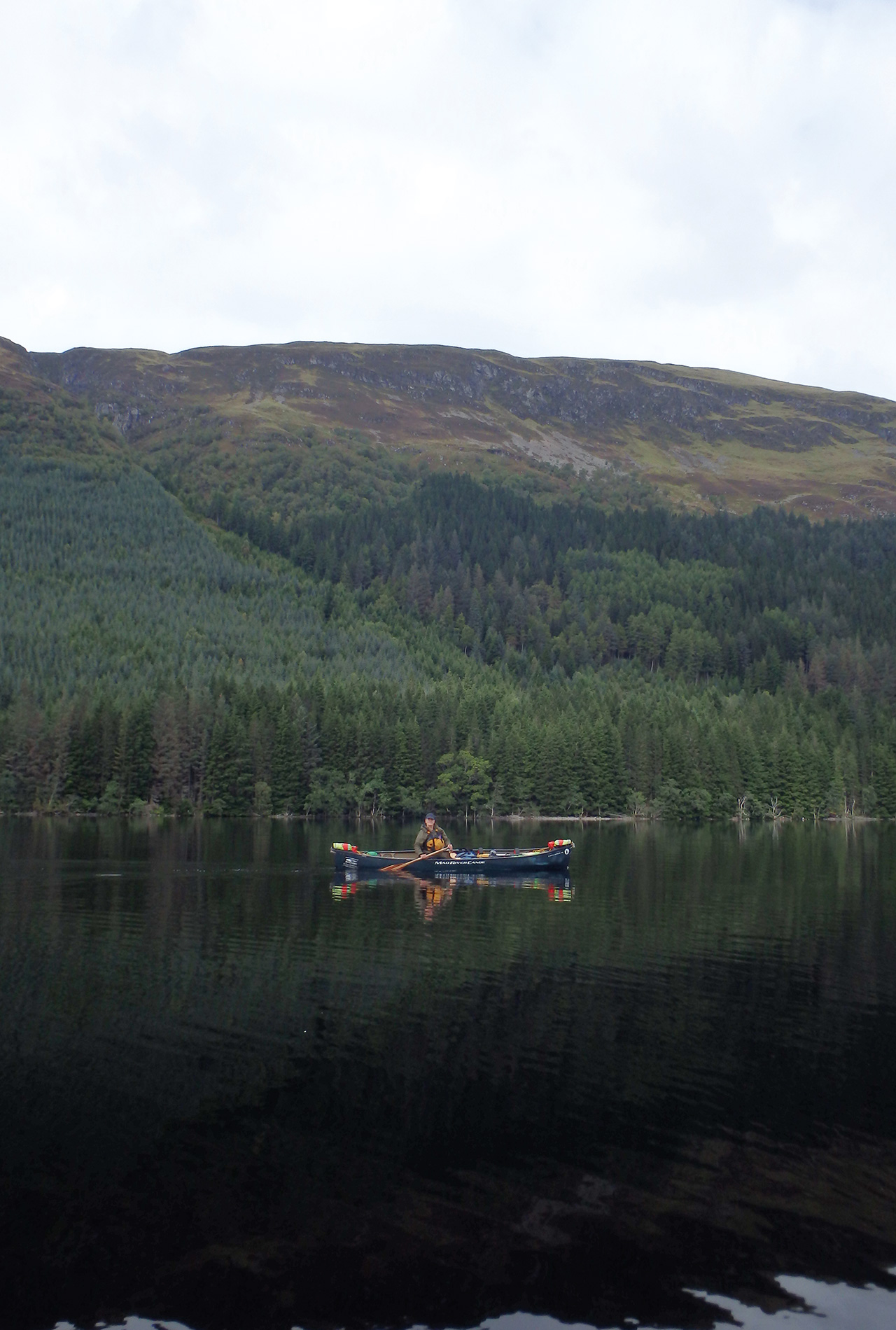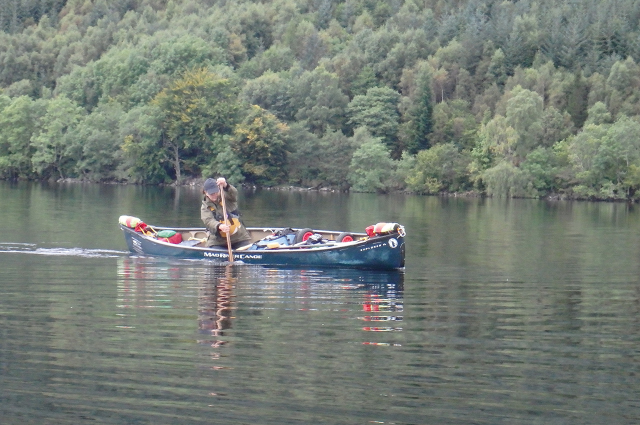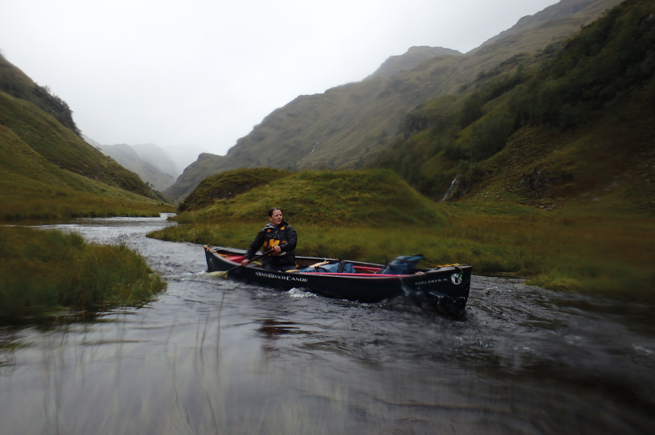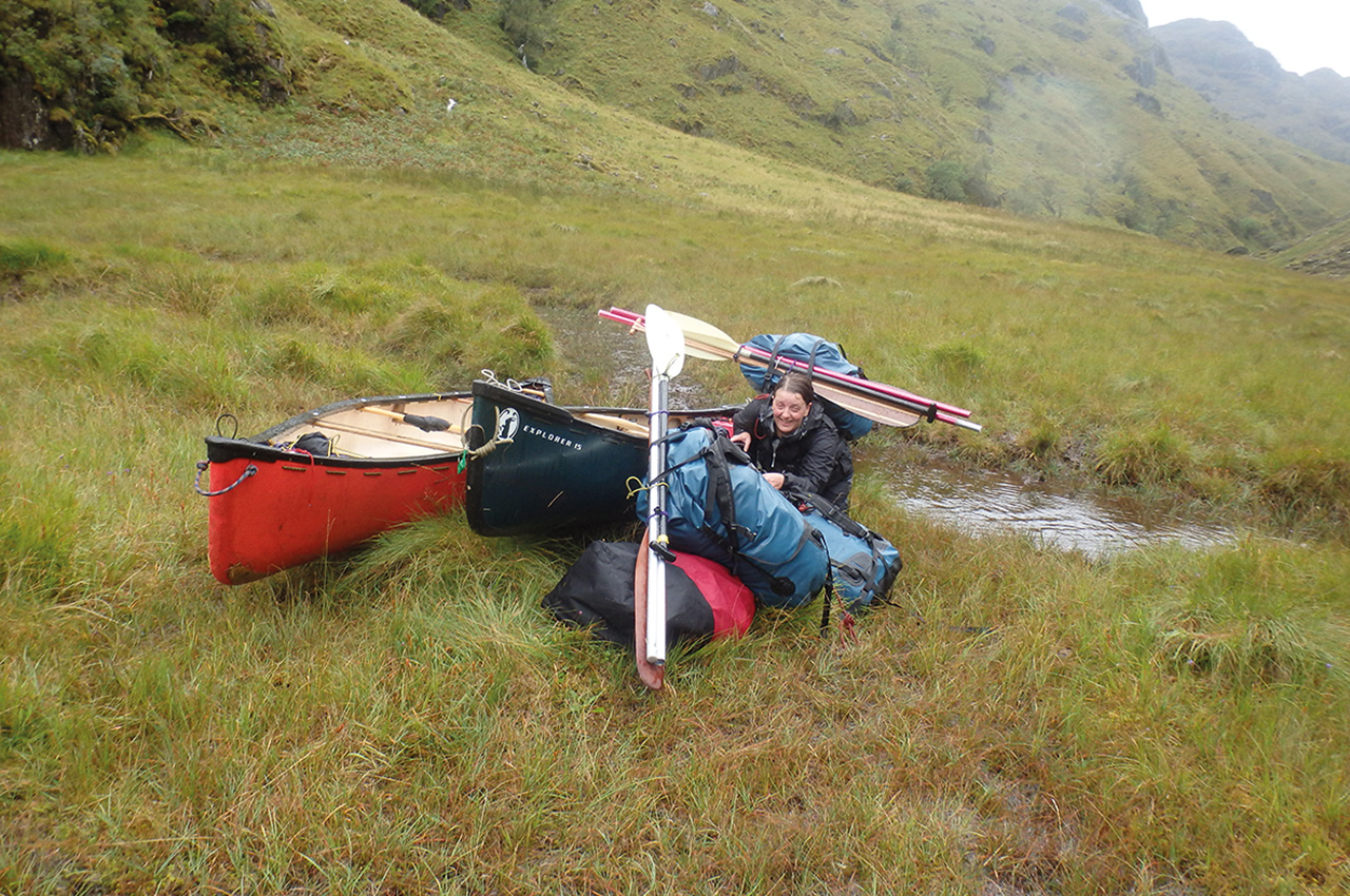 It was such a relief to be able to walk in one direction after the previous two days of going backwards and forwards. Being able to use traditional lining skills certainly saved us a great deal of time and energy. Slowly the river deepened and widened which allowed us to paddle onwards and into a small loch. Under globules of thick heavy rain, we paddled past three wilderness fishermen who looked very bemused. I’m sure they were questioning how on earth we’d managed to get there in our canoes!