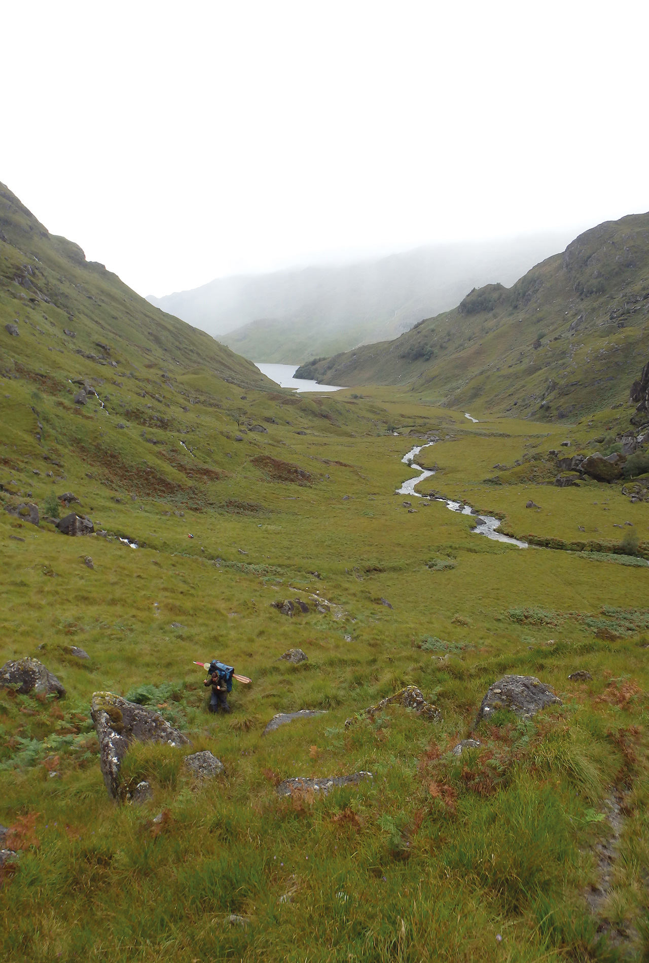 After another tasty breakfast of Posh Pork and Beans, we set off on the next section of the portage. It was basically mountaineering with canoes, paddles, poles, and portage bags in wet and windy conditions. The ground was slippy and slidy and sinking up to your knees in peat bogs was a regular occurrence. At one point, Adam was walking a little way in front of whilst carrying his boat.