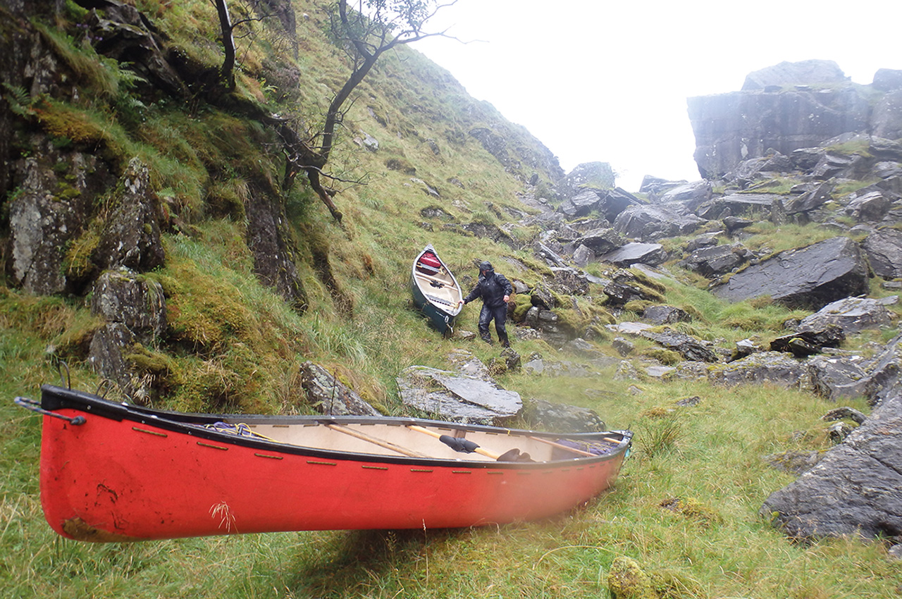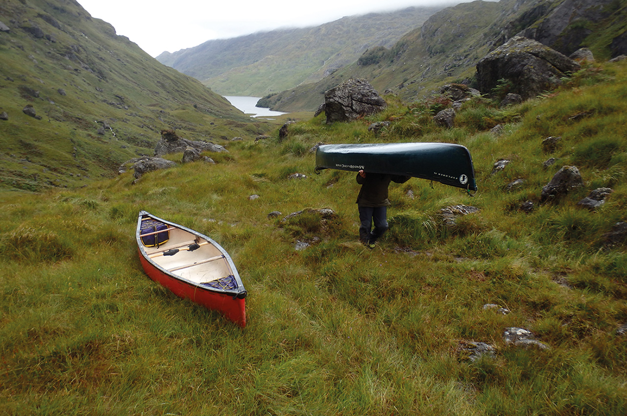 There was a chunky Grade 3 section in a gorge with steep-sided banks. With light boats and fresh minds, it would have been fun to pick a line and paddle it. Considering that we’d had an extremely strenuous two days and were in an isolated location, a discretionary portage was the only sensible option. When there is doubt, there is no doubt. After about 800m portaging, we managed to get back onto the water for the final few kilometres of gentle smooth meandering river which carried us into Loch Arkaig.