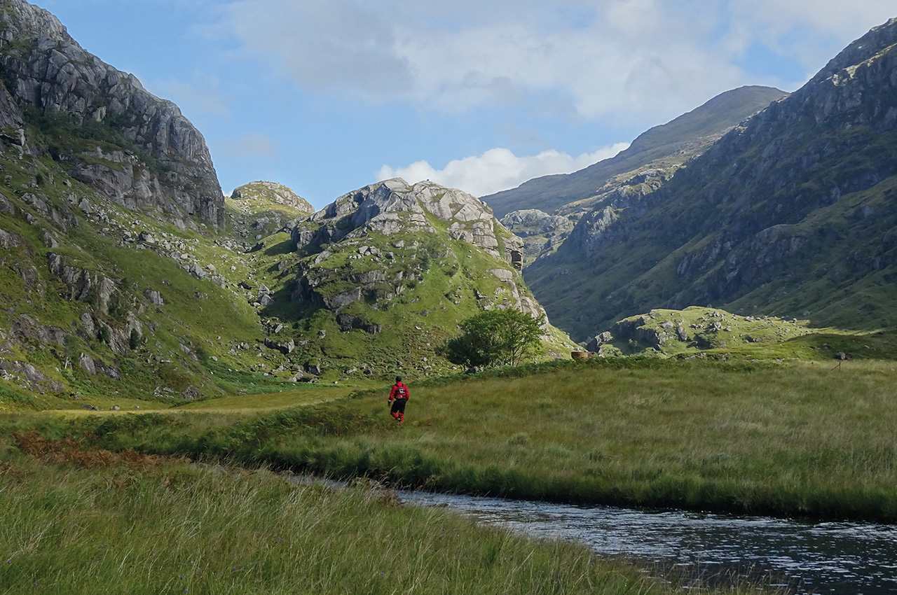 For what seemed like hours, the taunting flat green sections of easy-looking ground never appeared to get much closer. On occasions, the path itself narrowed to less than a foot wide, with a 10-metre drop to one side and steep ground on the other side. It certainly paid to be sure-footed. Finally, we used ropes to slide the boats down a small slope at the end of the portage and then emerged onto the much needed flat grass section. We had succeeded in breaking the back of the portage and entered Glen Pean. It would be all downhill from here. Finding the top of the river at Glen Pean, a tiny 1.5 metre wide stream a few inches deep, we managed to line them for approx 2km.