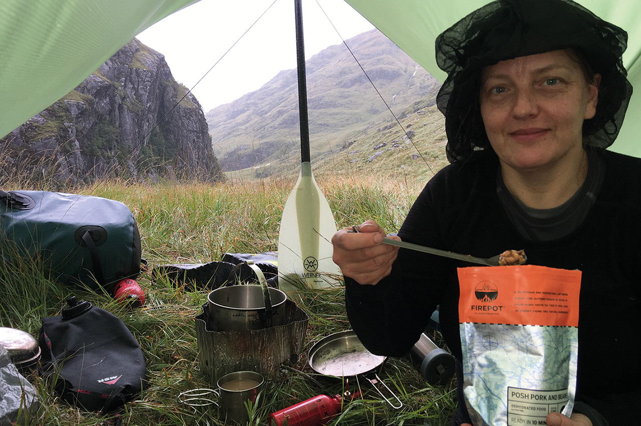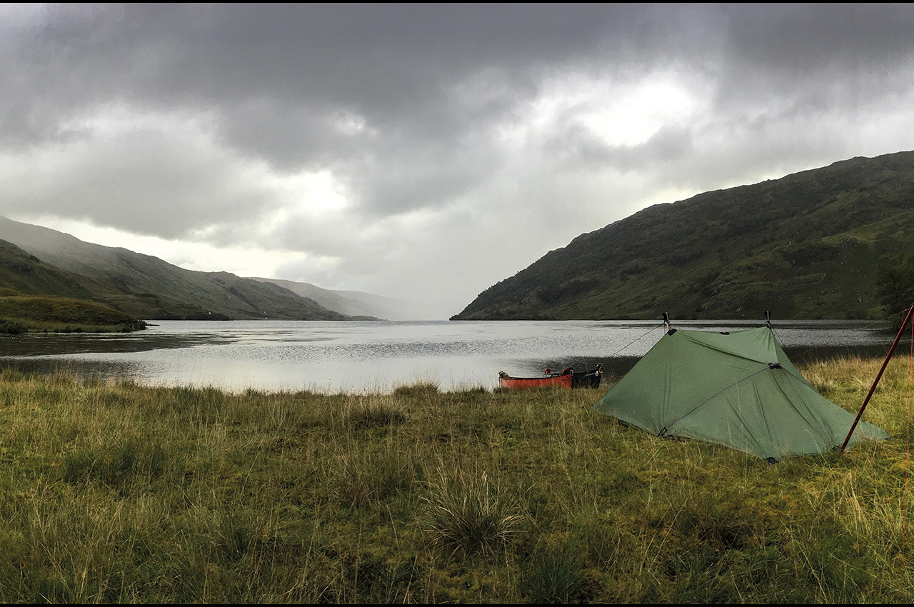 We cruised to our right finding a small beach where we could set up our tarp and enjoy stunning views of the loch. One very unexpected sight was of a tiny frog which we could see inching slowly up the outside of the tarp. It moved so slowly towards the top of the tarp and then put on a burst of speed which caused it to nose-dive over the top and land headfirst right in front of me. Remaining motionless and ’frogs legs akimbo’ for several minutes before it finally scuttled off into the grass. Sitting with this joyous view whilst savouring our Firepot Orzo Bolognaise and drinking steaming hot chocolate, we felt tired but encouraged.