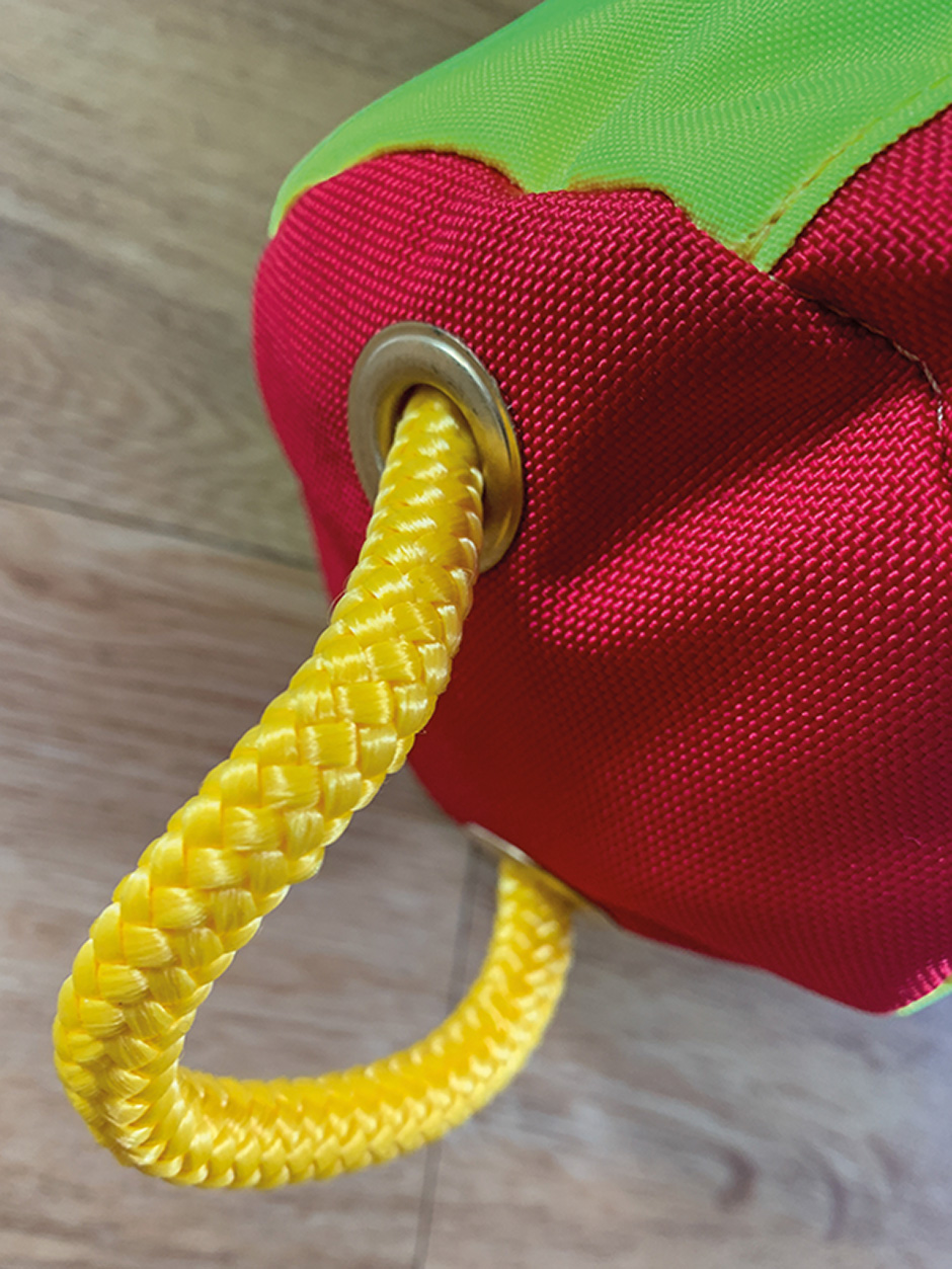 The top of the bag has nice wide opening with red braid that helps keep it open. The braid is also used to create a set of handles for use whilst throwing.