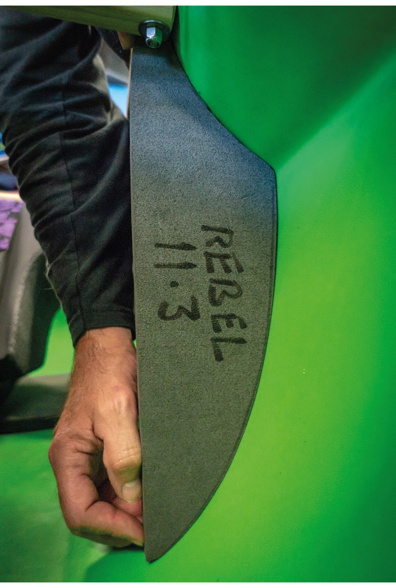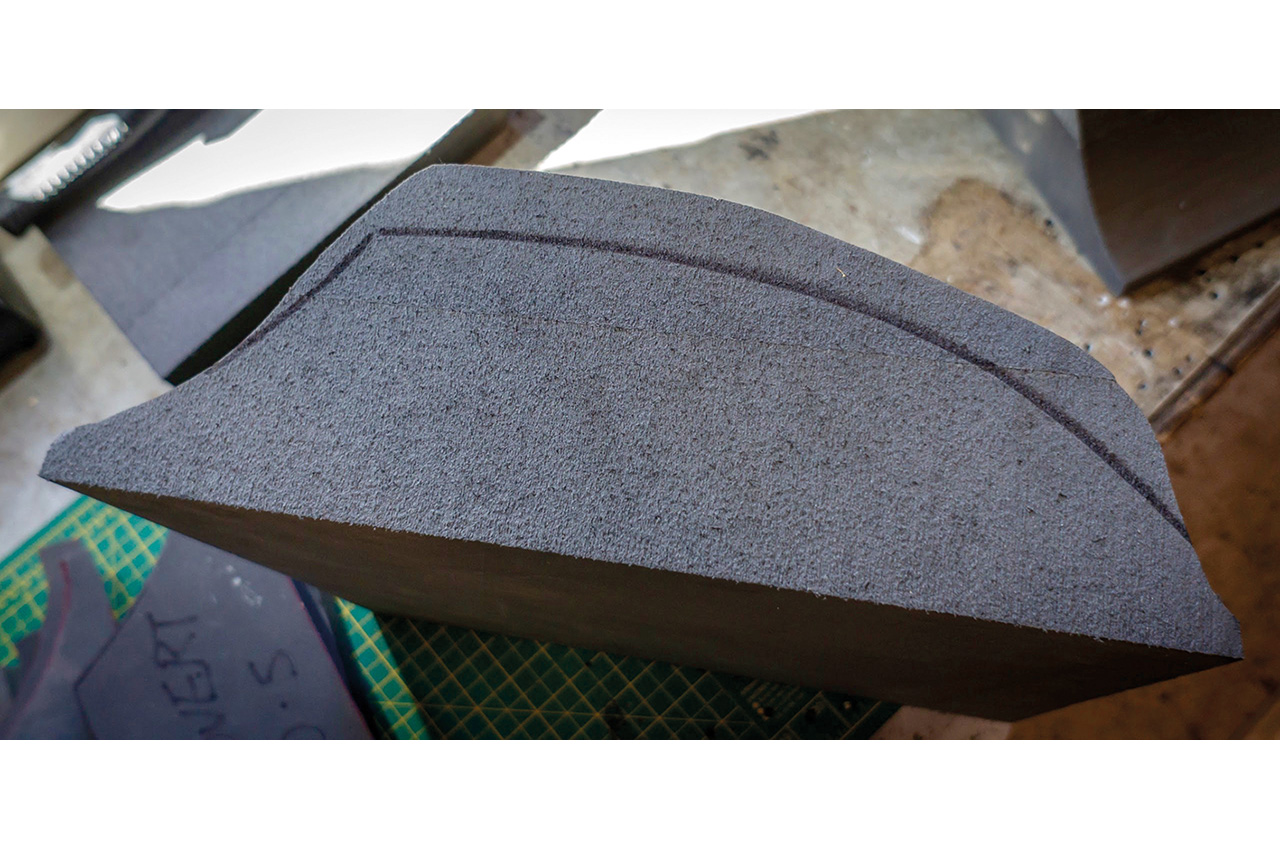 I do this by making a template of foam or cardboard to the shape and fit that I need. I use the template to mark the sidewalls with a marker pen (see photos), to give me cut lines to work to. You may need to make a template for each side of the boat. To achieve best results, take your time to shape the sidewall once it’s marked up so that it fits really well when glued into the boat. Larger paddlers might need to reduce the overall depth of the sidewall. Some people carve a shape for the outer edge of their thighs on the front of the sidewall, which in effect extends the thigh hooks to give better connection on the thighs.